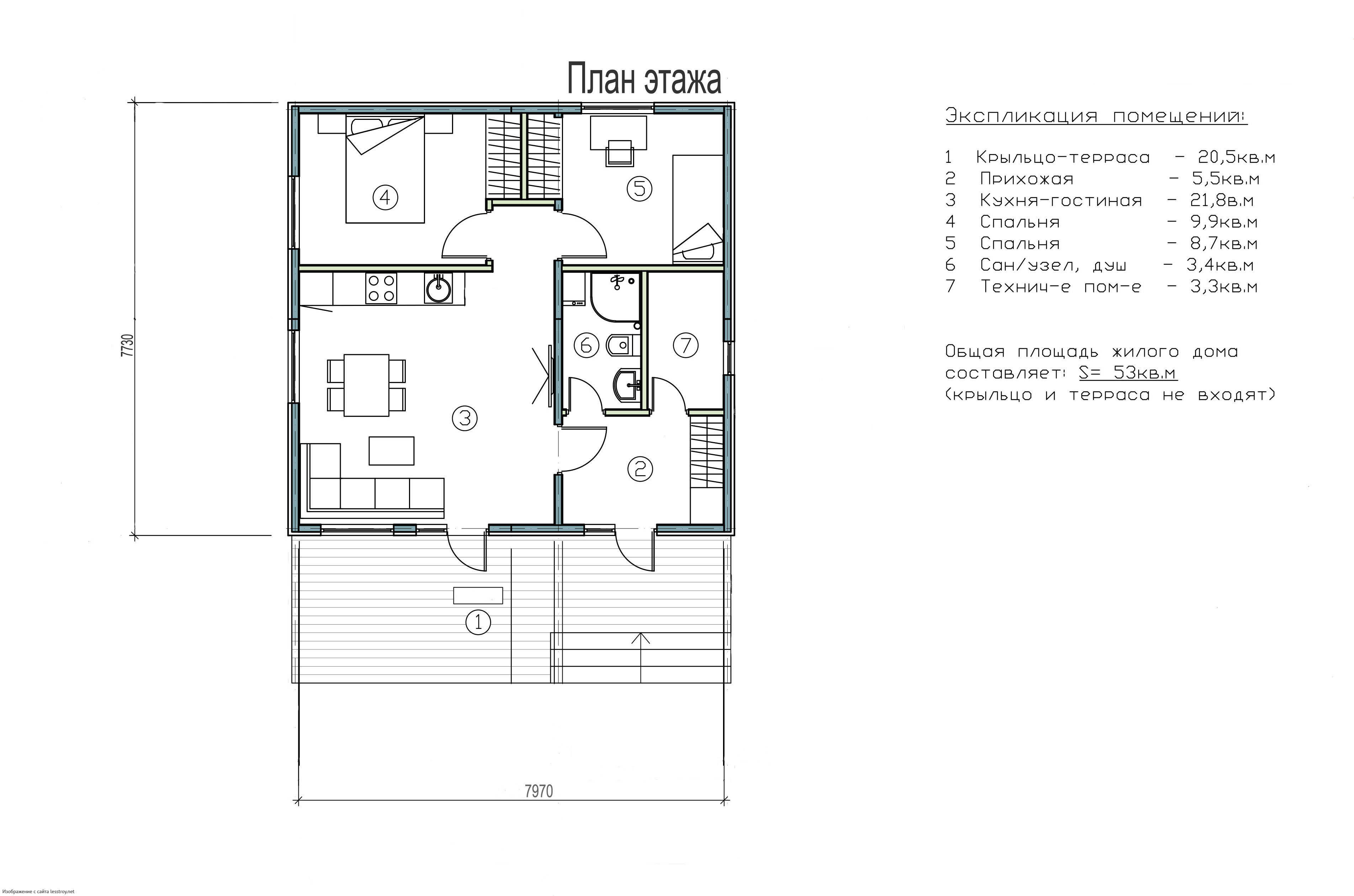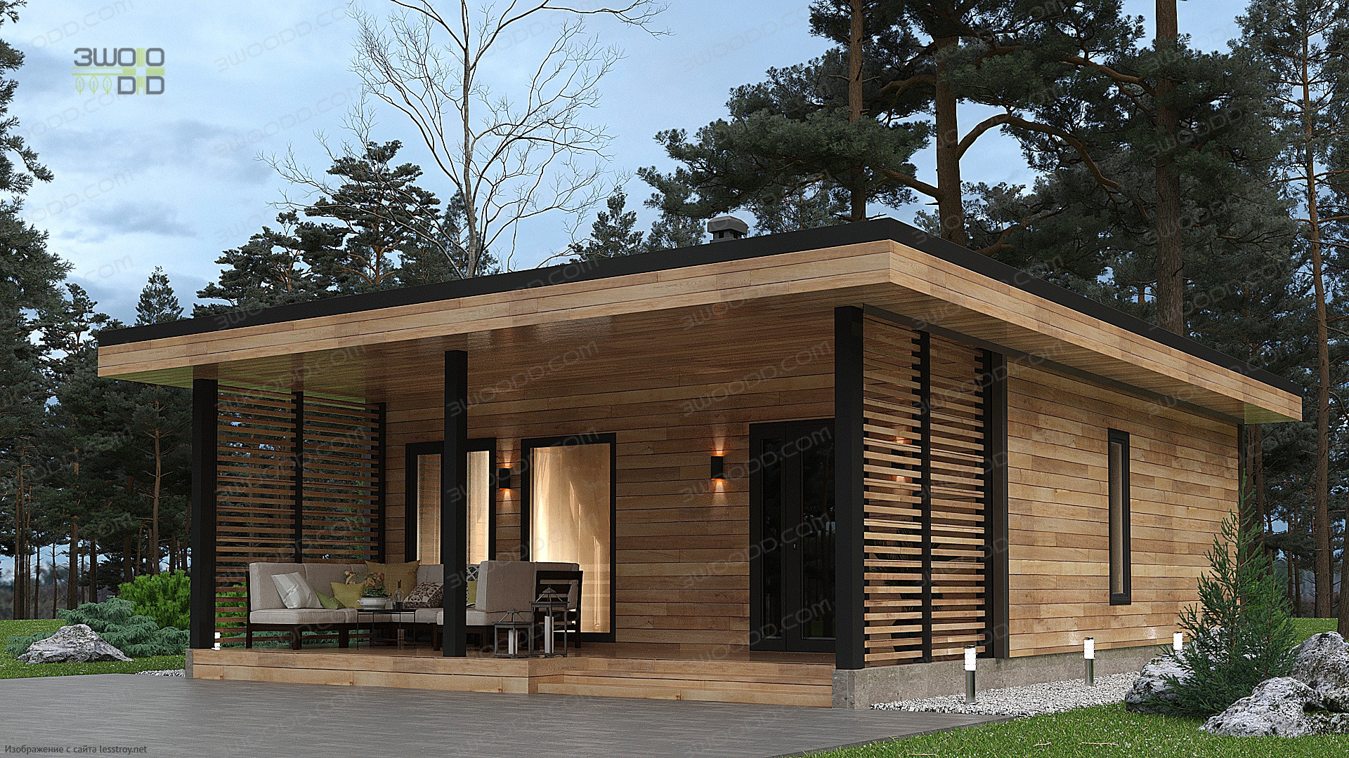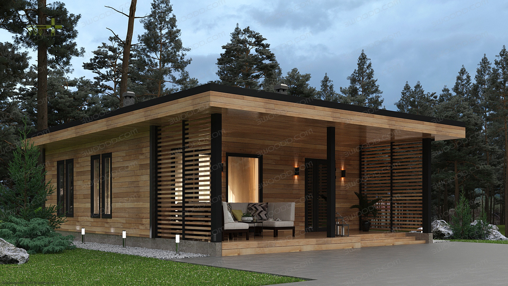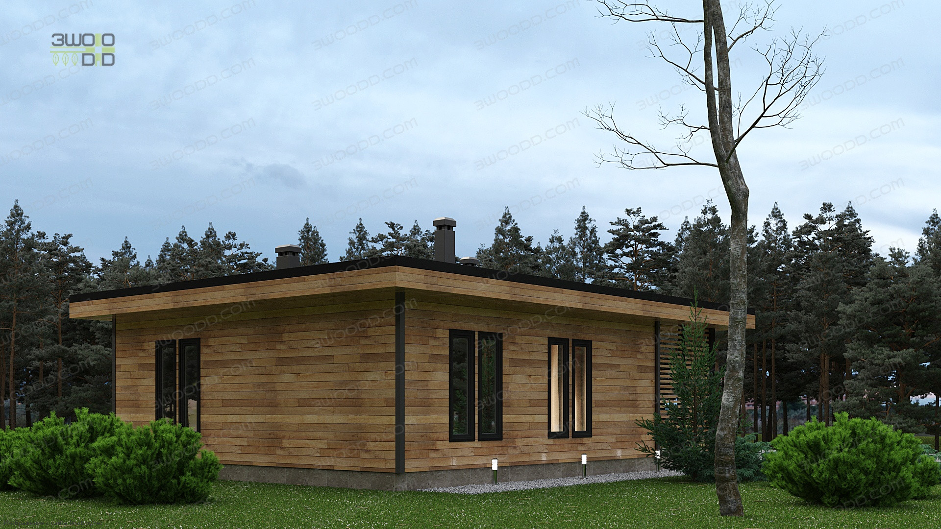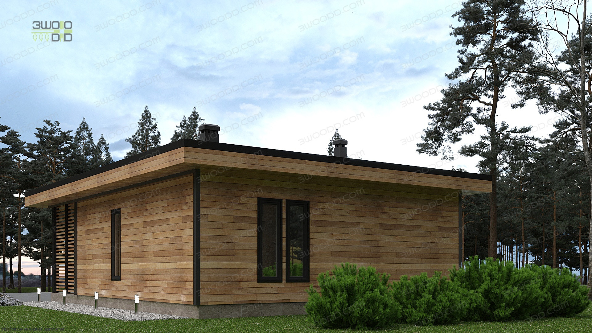 Проект одноэтажного дома 3051 - каркасный дом с плоской крышей с двумя спальнями