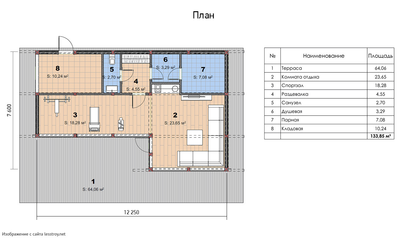 Архитектура создает ощущение легкости и простора. С такими 87 м² возможна любая конфигурация комнат. Двухэтажная просторная планировка разграничивает спальные и дневные помещения. В качестве кровли использована рубероид — материал, проверенный временем. Количество спален — 3, делая планировку гибкой.Характеристики