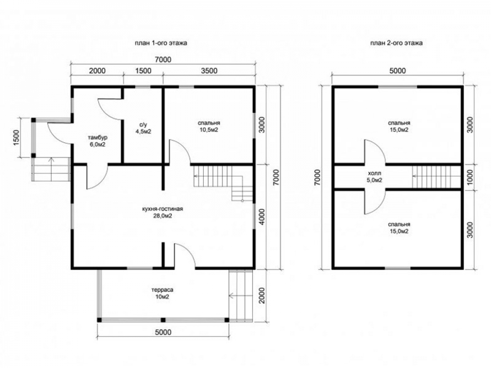 Проект двухэтажного дома Д-40 дом из бруса 7,0х7,0м с террасой 2,0х5,0м под отдельной крышей