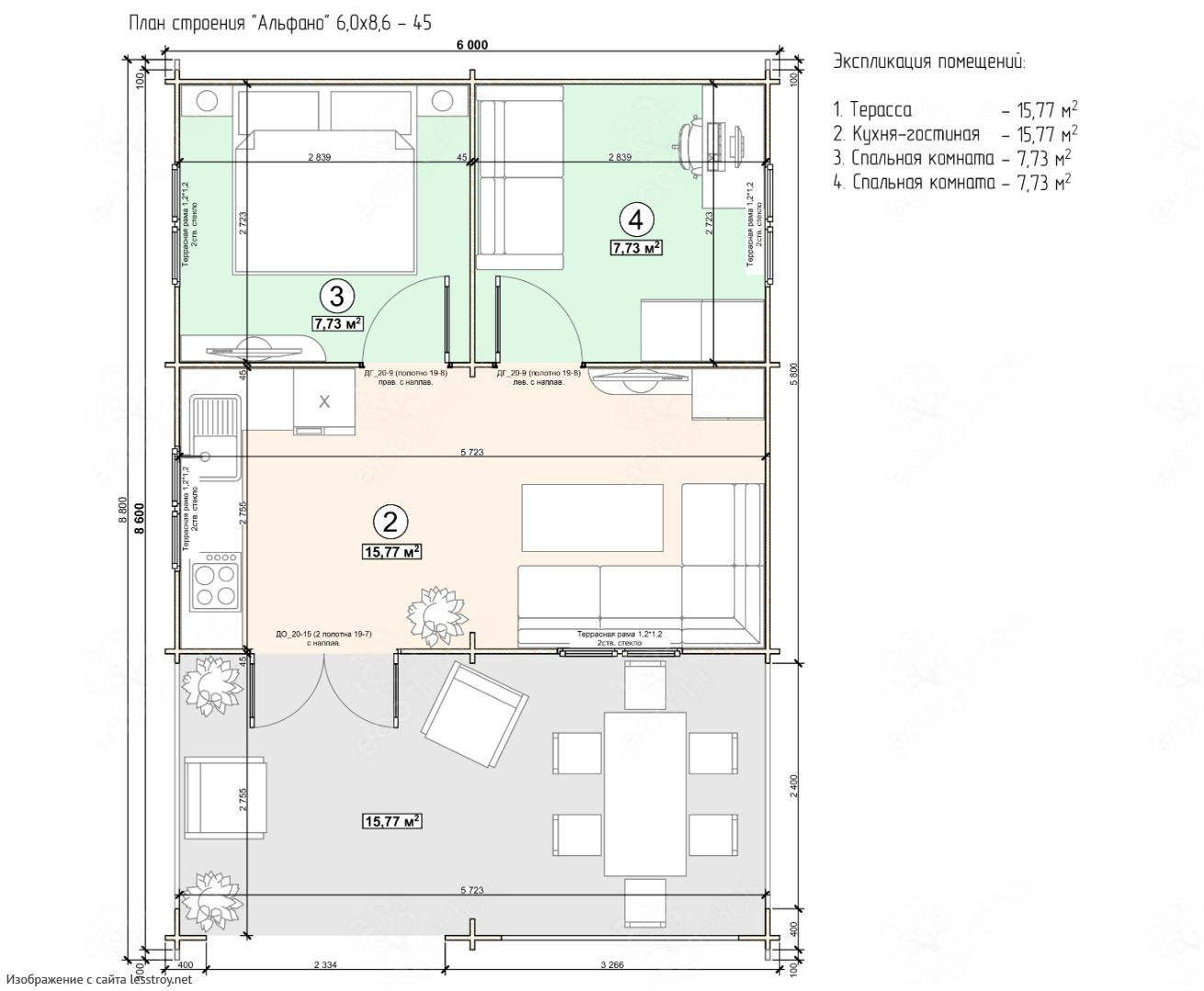 Проект одноэтажного дома Дачный дом Альфано (6,0х8,8х3,6м), площадь 48.4 кв.м., брус 135х45/60/90мм