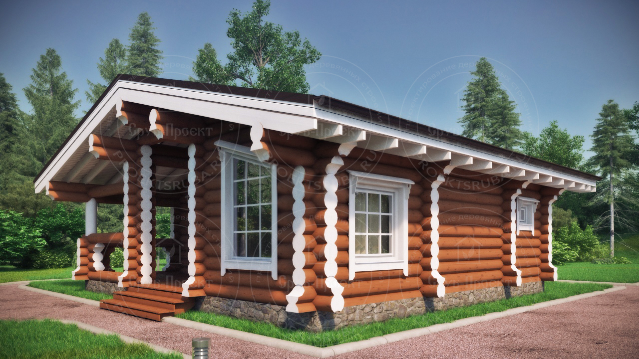 Компактный одноэтажный проект из оцилиндрованного бревна, площадь 60 м². Отличное решение для пары, небольшой семьи или как гостевой дом. Древесина создает неповторимое ощущение уюта, а простота форм — идеальна для уединенного отдыха. Надежная защита от осадков обеспечивается рубероидомХарактеристики