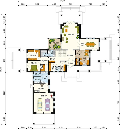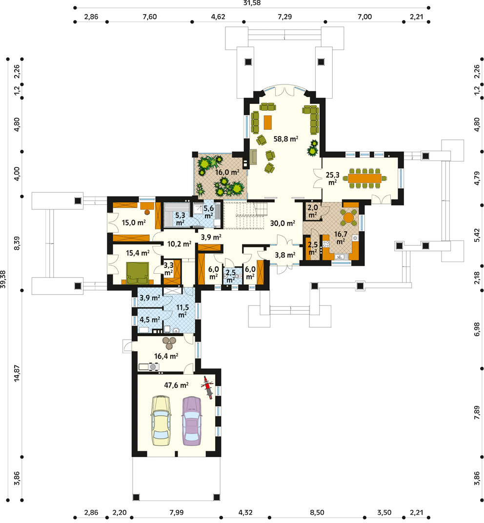 Двухэтажный дом из газобетона площадью 388 м² с пятью комнатами и четырьмя санузлами. Гараж на две машины интегрирован в проект, что удобно для семьи с несколькими автомобилями. В доме просторная кухня-гостиная, приватные спальни и дополнительные зоны для работы или отдыха. Такой дом отлично подойдёт для большой семьи, ценящей масштаб и комфортГарантии: 16 лет гарантии