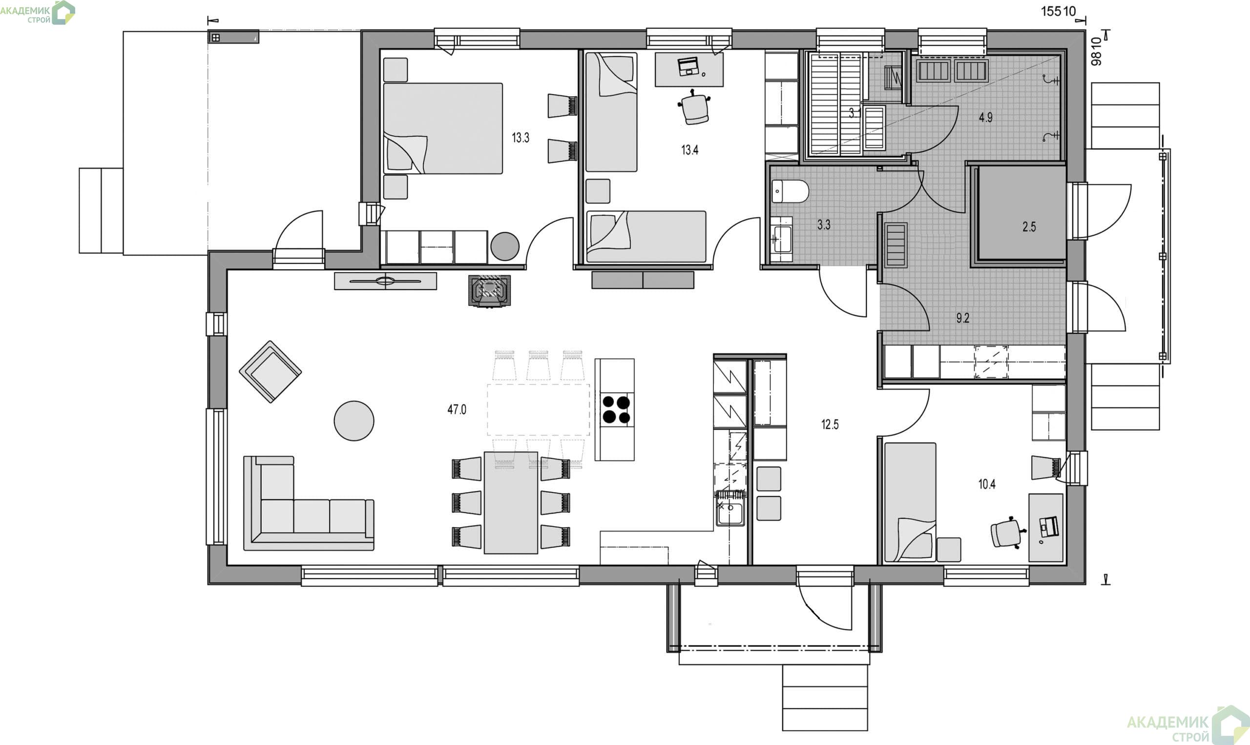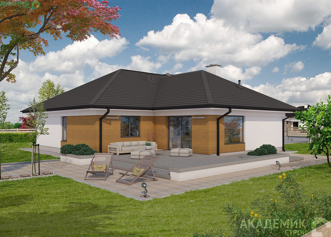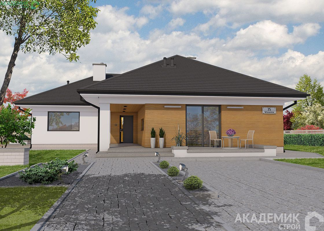 Одноэтажный дом площадью 185 м² (жилых — 176 м²) с пятью комнатами и тремя санузлами — это настоящий простор для большой семьи. В проекте нет гаража, зато предусмотрена большая кухня-гостиная и отдельные спальни для каждого члена семьи. Светлые интерьеры и высокий потолок создают ощущение свободы. Такой дом отлично подойдёт для тех, кто любит принимать гостейГарантии: 16 лет гарантии