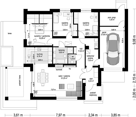 Двухэтажный дом площадью 173 м² (жилых — 101 м²) с тремя комнатами и двумя санузлами подойдёт для семьи, предпочитающей современный стиль жизни. Гараж на одну машину интегрирован в архитектуру, а большая кухня-столовая отлично подходит для семейных обедов. В доме много света и воздуха благодаря большим окнам.Гарантии: 16 лет гарантии