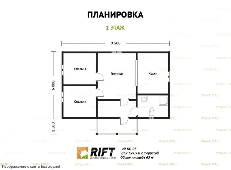 Компактный бревенчатый дом площадью 63 м² с двумя спальнями создает теплую атмосферу загородного отдыха. Ондулин на кровле дополняет его деревенский шарм.Характеристики