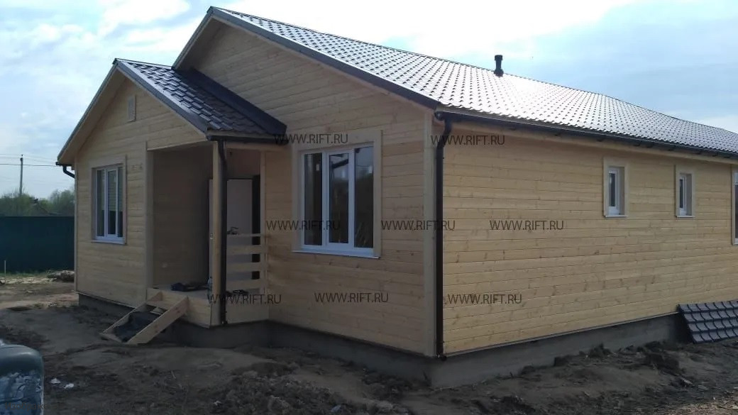 Уютный одноэтажный дом из бревна площадью 142 м² с тремя спальнями идеален для семьи. Ондулин на кровле гармонично дополняет его облик.Характеристики