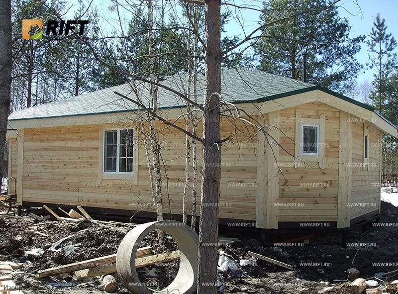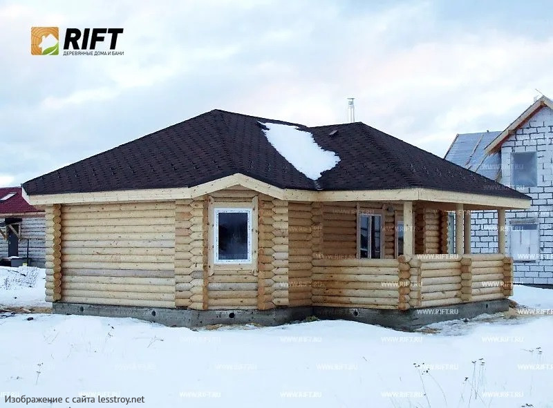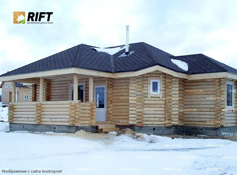 Миниатюрный дом из бревна площадью 96 м² с двумя спальнями идеален для дачного отдыха. Ондулиновая кровля делает его практичным.Характеристики