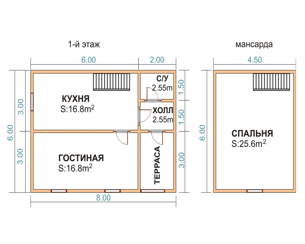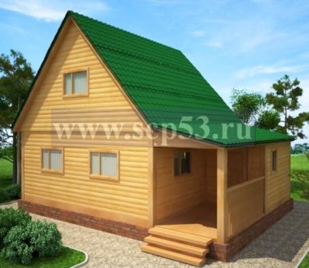 Проект одноэтажного дома Дом из бруса 6х8м с террасой ПД-7