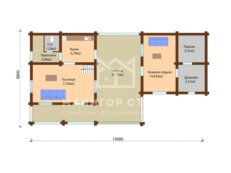 Здесь даже кладовка кажется уютной. Интерьер выстраивается вокруг 108 м² уюта и свободы. Стены из бревна хорошо держат тепло и защищают от шума. Крыша из рубероид подчёркивает современный облик дома. Проект включает 1 спальня — удобно для семьи.Характеристики