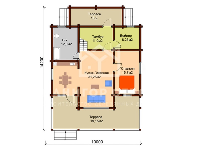 Стильный подход к современному образу жизни.151 м² позволяют создать как уединённые, так и общие зоны. Стены из бревна хорошо держат тепло и защищают от шума. Материал кровли — рубероид, что добавляет зданию индивидуальность. Проект включает 4 спальни — удобно для семьи.Характеристики