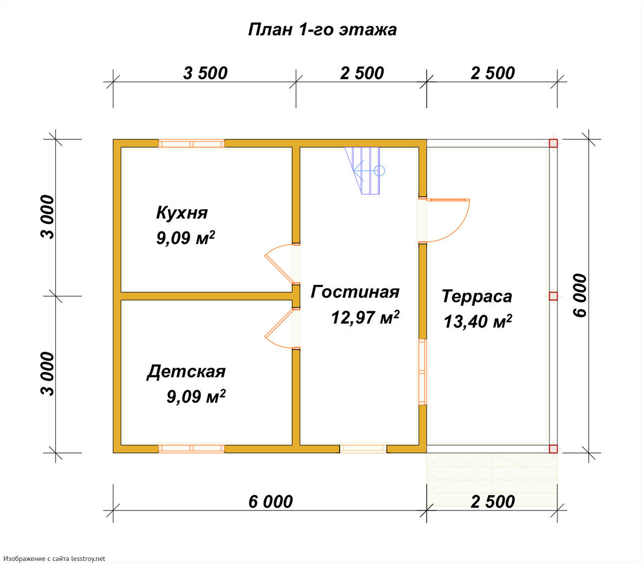 Проект, в котором продумано место для хранения вещей.52 м² — оптимальный метраж для комфорта и уединения. Стены из Брус хорошо держат тепло и защищают от шума. В доме предусмотрено 2 спальни, что важно для комфорта. Материал кровли — ондулин, что добавляет зданию индивидуальность.Характеристики