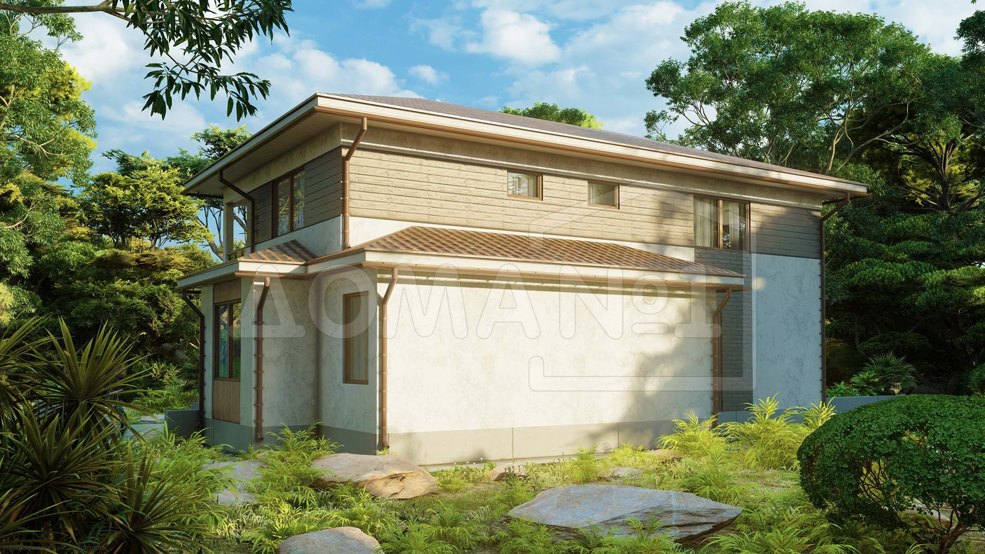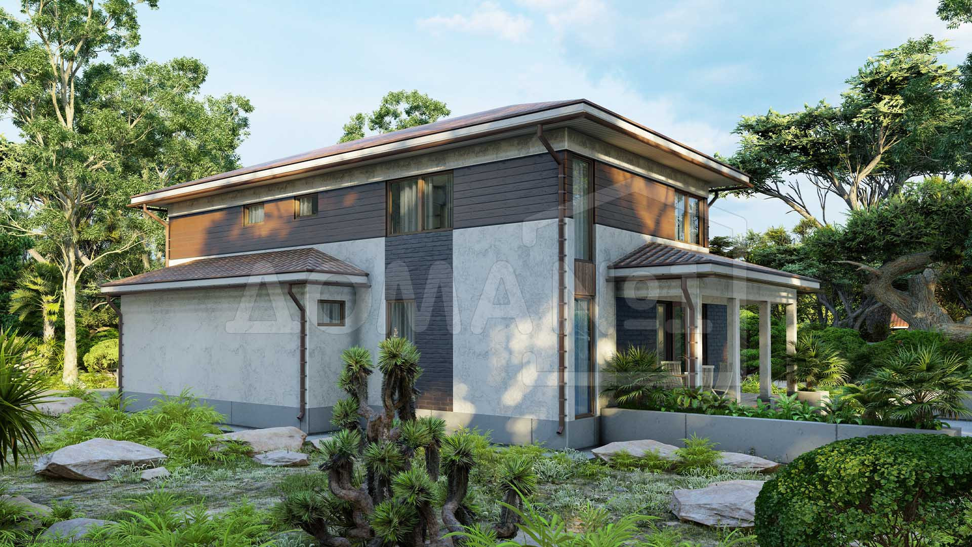 Здесь стекло и бетон гармонируют с теплом дерева и семейных уз.Площадь 114 м² — подходящий вариант для молодых семей. металлочерепица придаёт дому выразительность и надёжность. В доме предусмотрено 4 спальни, что важно для комфорта. Каркаса делает дом надёжным при любой погоде.Характеристики