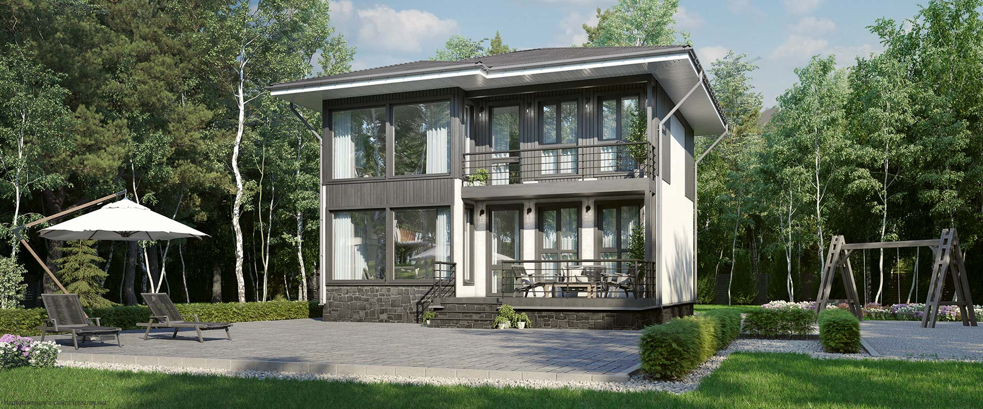 Каркасный дом площадью 141 м² с четырьмя спальнями выполнен в оригинальном стиле. Двухэтажная планировка создает просторные интерьеры. Легкие конструкции делают строительство быстрым. Проект идеален для тех, кто ценит нестандартные решения.Характеристики