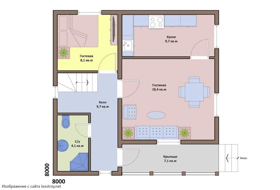 Проект, в котором отопление равномерное и экономичное Планировка построена вокруг 96 м² простора и логики. Материал кровли — металлочерепица, что добавляет зданию индивидуальность. Двухэтажная современная планировка организует пространство максимально эффективно. Выбор Бруса обусловлен его теплоизоляционными свойствами.Характеристики