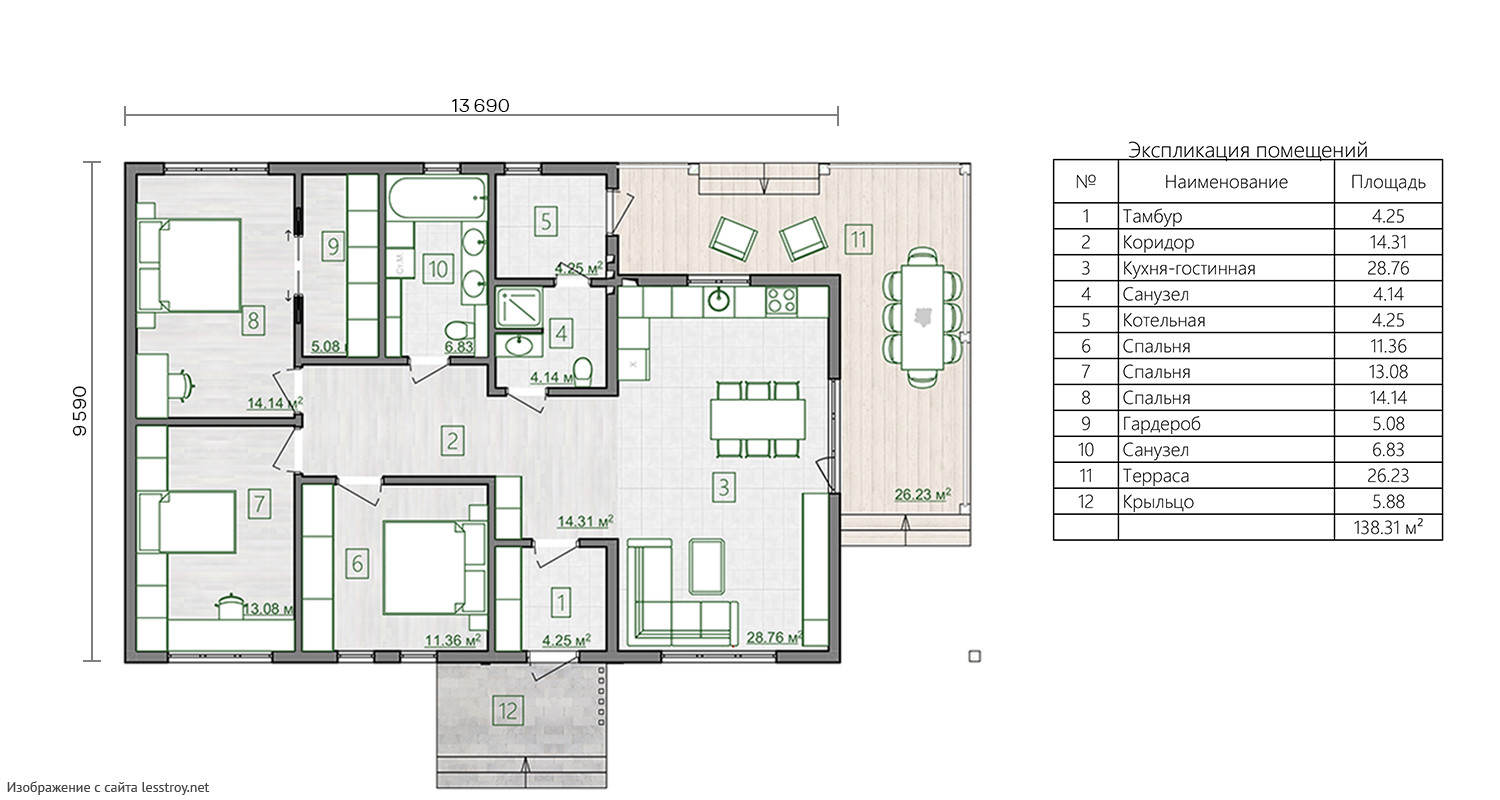 Пространство, где даже самый требовательный жилец найдёт своё место. Благодаря 138 м² можно реализовать все бытовые задачи с комфортом. Крыша из металлочерепица подчёркивает современный облик дома. Количество спален — 3, делая планировку гибкой. Стены из Каркас хорошо держат тепло и защищают от шума.Характеристики