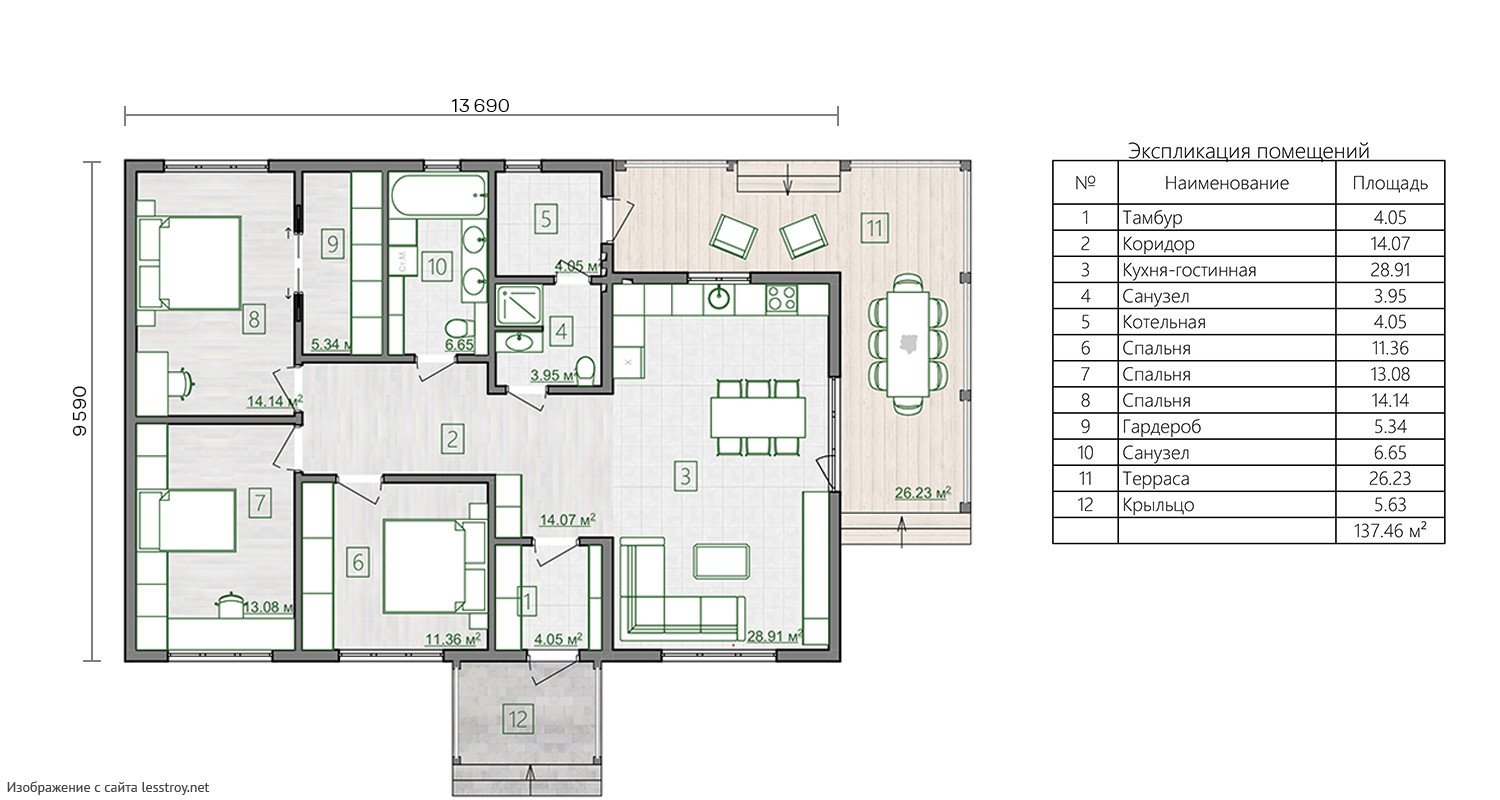 Уютное гнёздышко для тех, кто ценит камерную атмосферу. 138 м² под одной крышей — всё необходимое здесь. Архитектура выполнена в стиле дома в классическом стиле. Количество спален — 3, делая планировку гибкой. Одноэтажная удобная планировка разграничивает спальные и дневные помещения.Характеристики