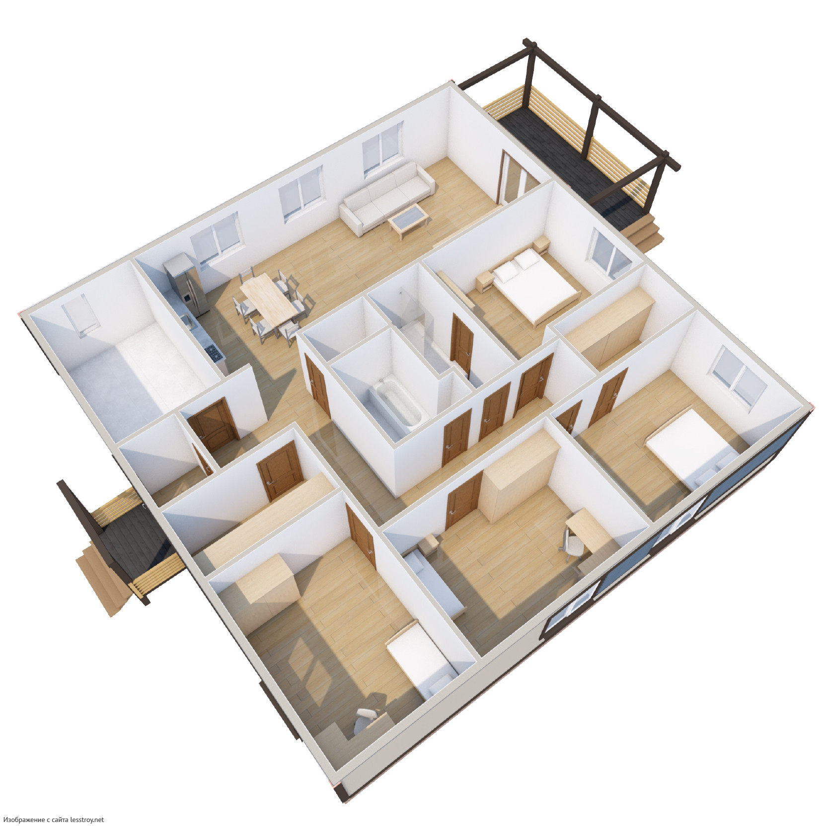 - Тип кровли: Дома с четырехскатной крышей (вальмовой)