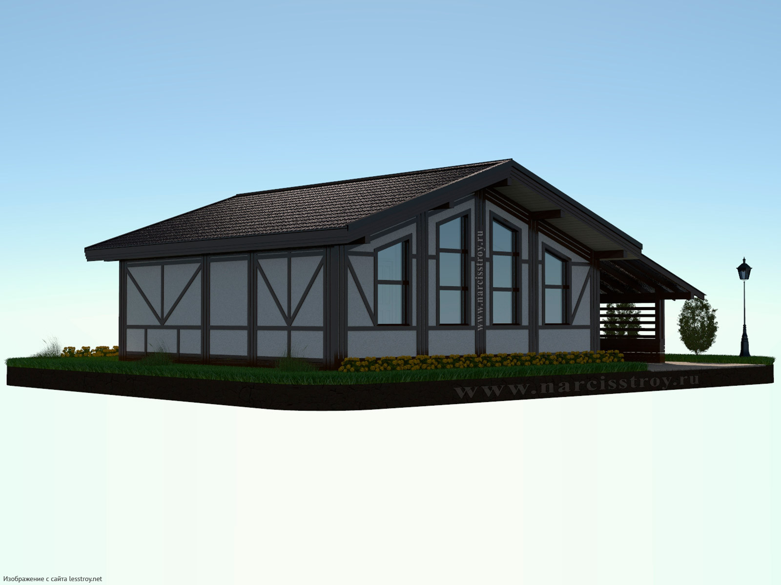 Компактный каркасный дом площадью 108 м² в стиле фахверк с металлочерепичной крышей. Вместительный навес для парковки и 2 спальни делают его практичным для небольшой семьи. Современный дизайн и функциональность сочетаются в этом проекте. Отличное решение для загородного отдыха.Характеристики