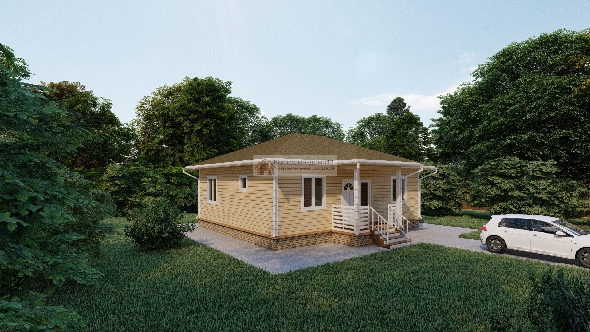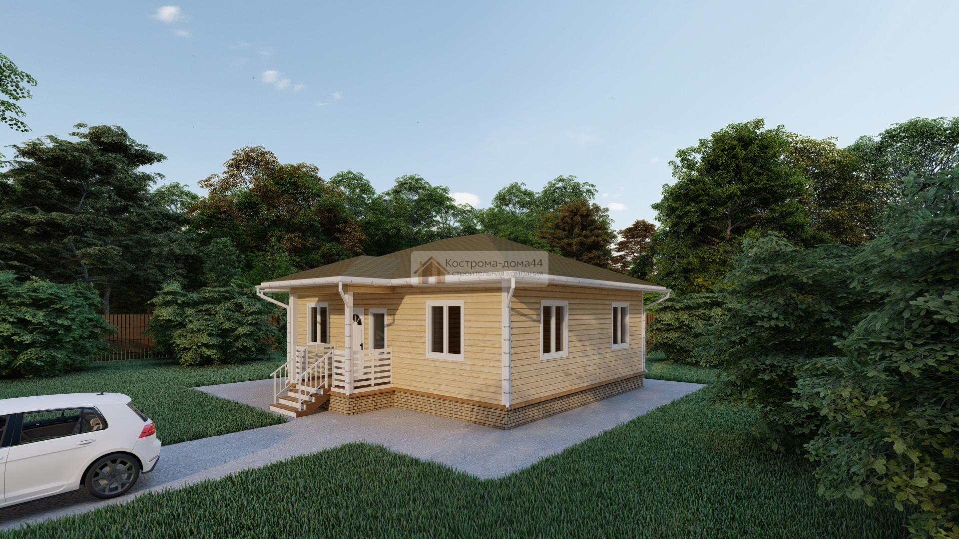 В его дизайне нет ничего случайного — только продуманное сочетание красоты и удобства.Дом из бруса площадью 64 м² — компактное и экономичное решение. Один этаж с одной спальней подойдет для одного человека или пары. Гостиная с панорамными окнами создает ощущение простора, а терраса расширяет жилое пространство. Деревянные стены делают интерьер теплым и естественным.Характеристики