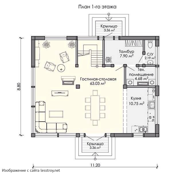 Архитектура этого дома — это гармония красоты и практичности. Жить в 55 м² — это удобно, красиво и рационально. Наличие 1 спальня удовлетворит запросы семьи с детьми. Крыша из ондулин подчёркивает современный облик дома. Дом спроектирован в духе дома в классическом стиле.Характеристики