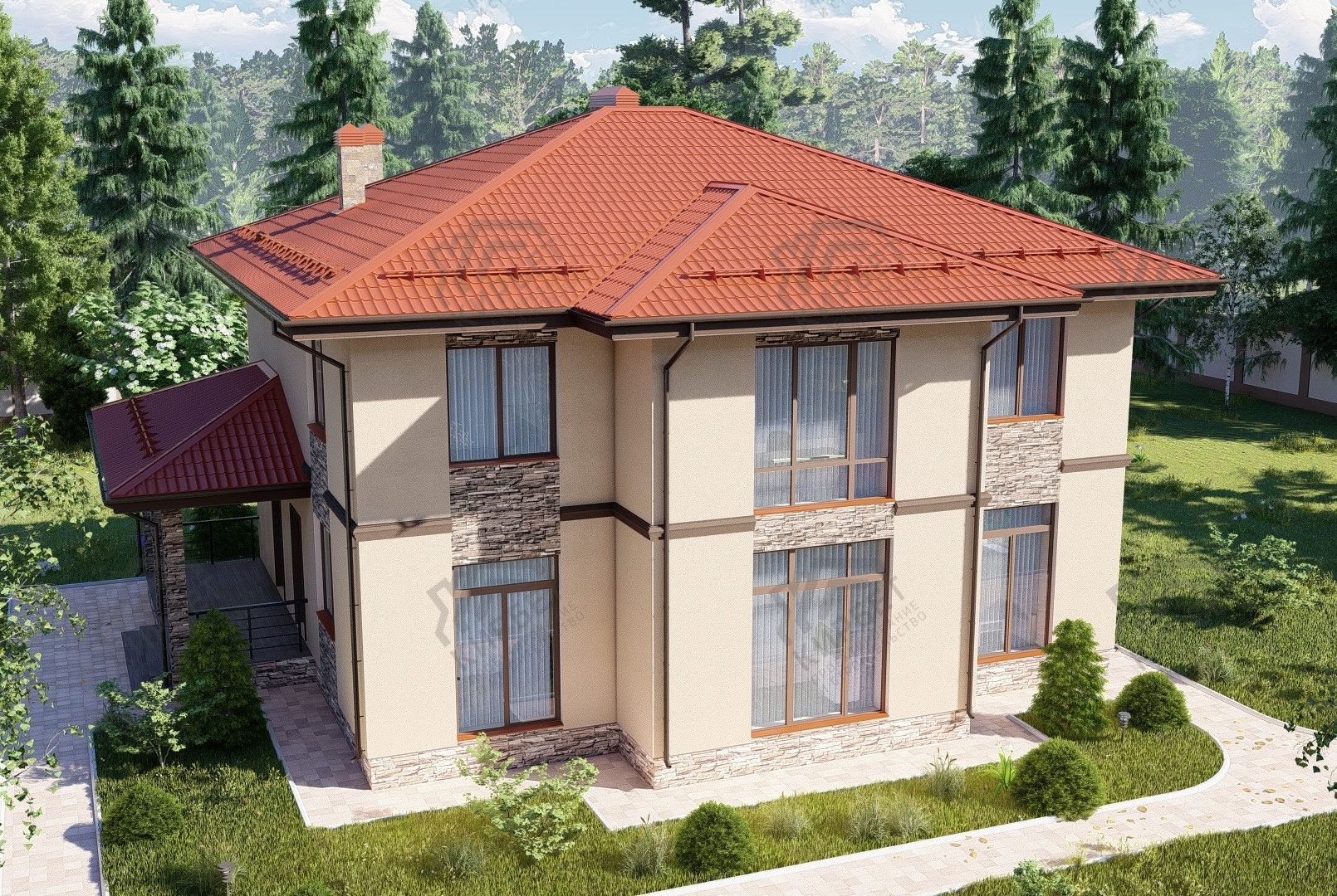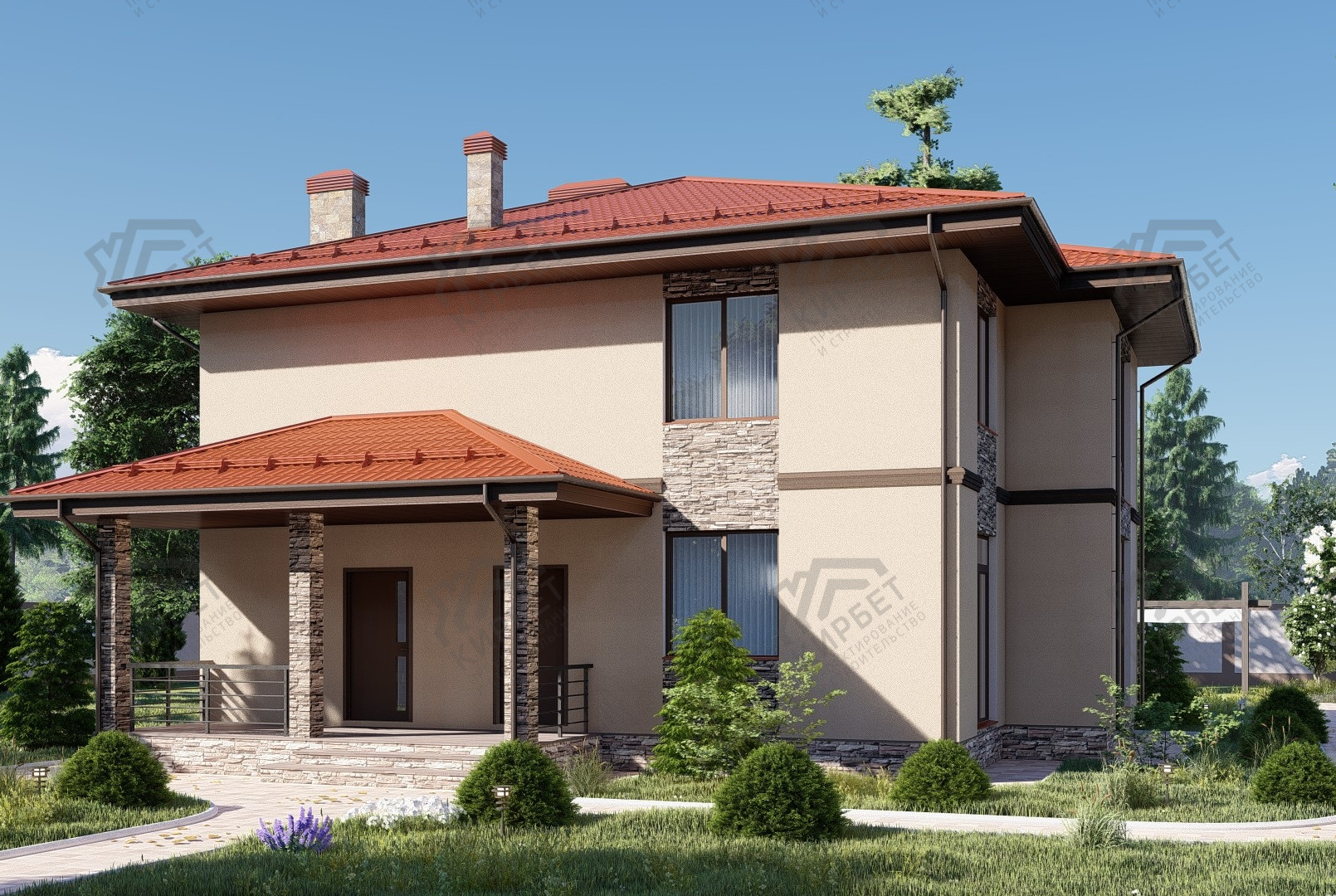 Двухэтажный дом из керамических блоков площадью 303 м² с четырьмя спальнями и вальмовой крышей. Черепичная кровля и просторные помещения делают его идеальным для большой семьи. Надежность и комфорт в каждом метре.Характеристики