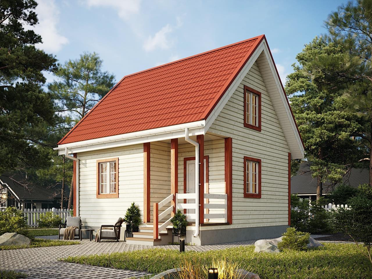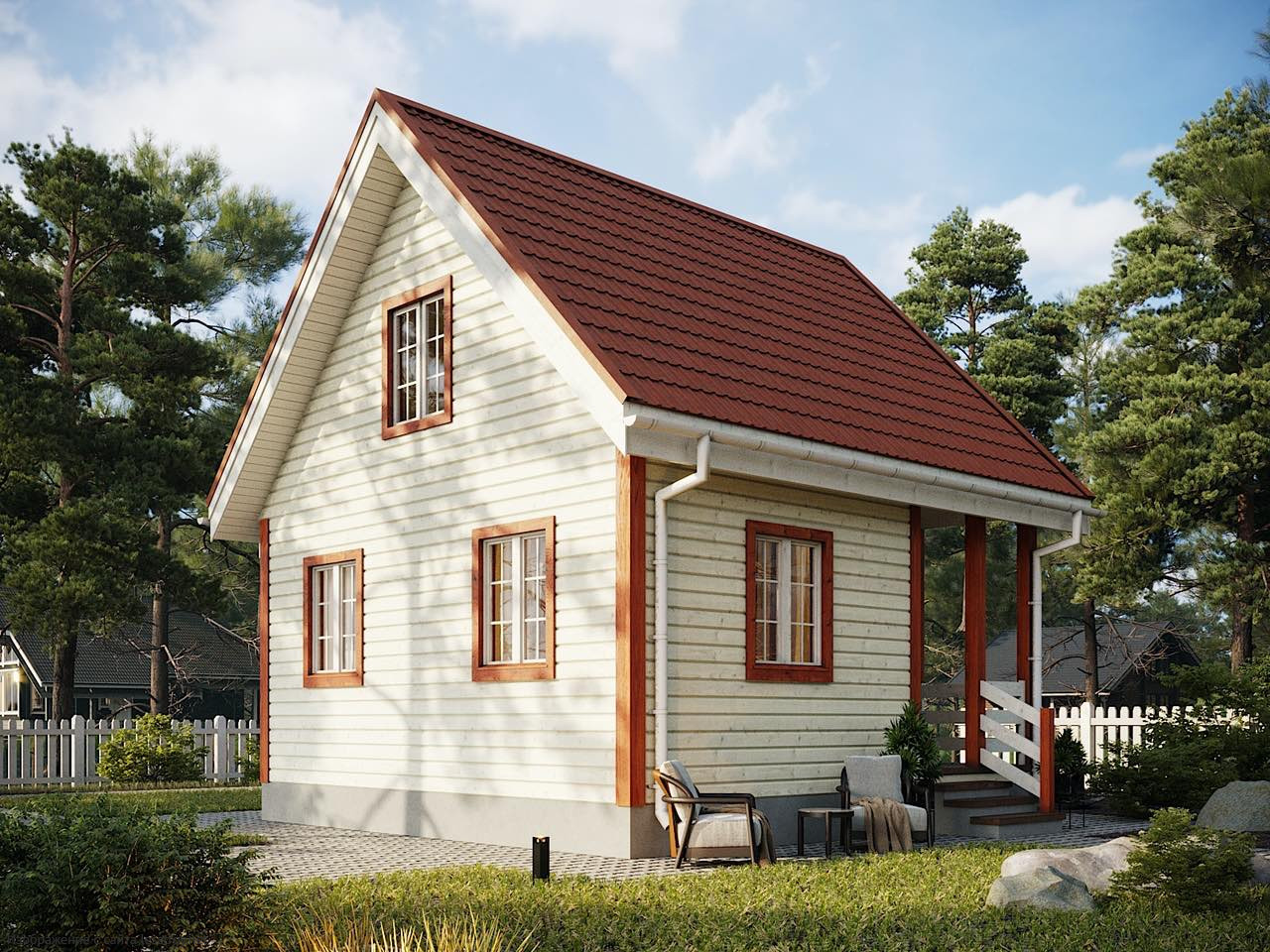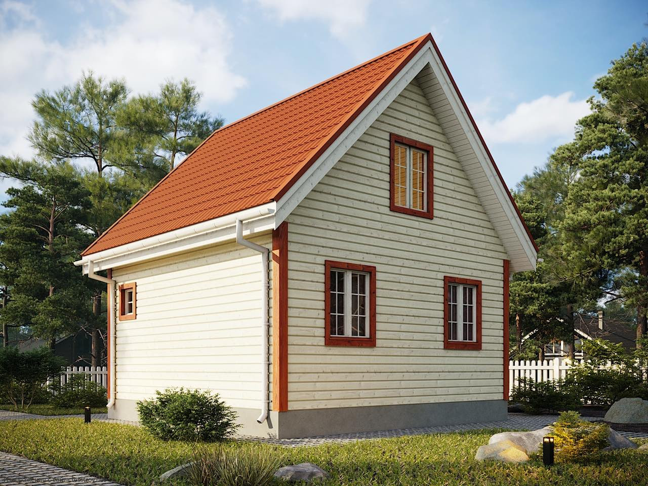 Миниатюрный каркасный дом площадью 55 м² с одной спальней подходит для временного проживания. Металлочерепица и мансарда добавляют ему уюта.Характеристики