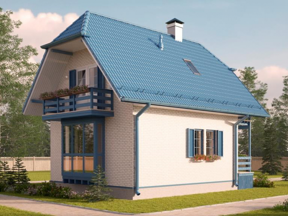Миниатюрный каркасный дом площадью 89 м² с двумя спальнями подходит для временного проживания. Черепичная кровля делает его уютным.Характеристики