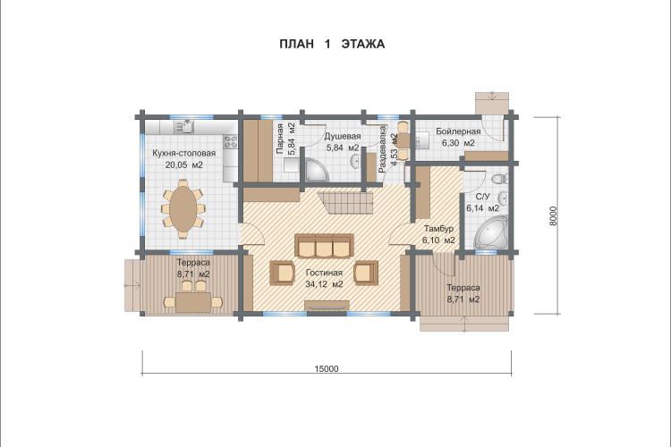 - стеновой комплект: брус клееный 185(h)х205 мм (сосна) с конструкционным запилом чашек под архитектурно-планировочное решение Заказчика