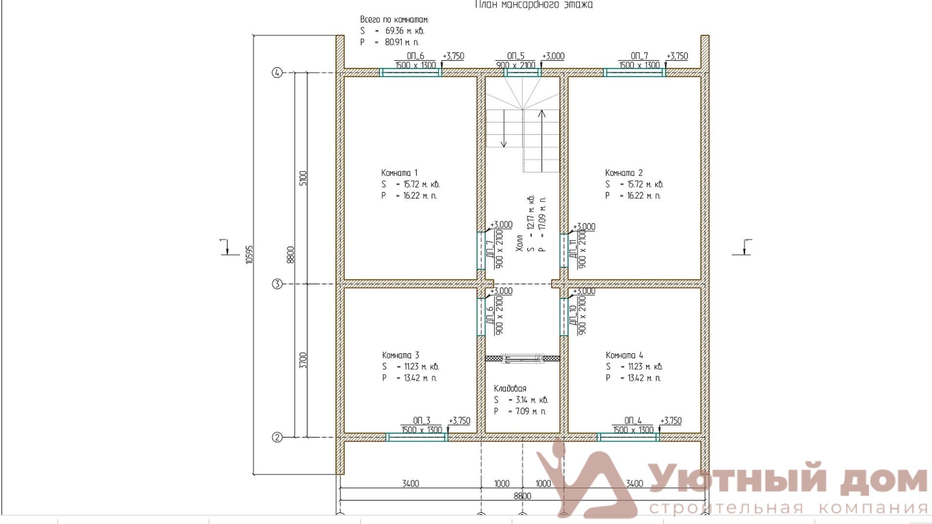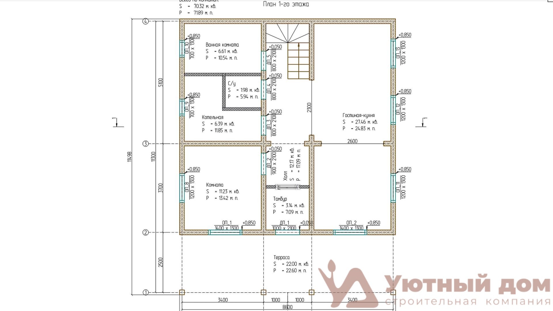 - Внутренние перегородки: брус 100*150 мм.