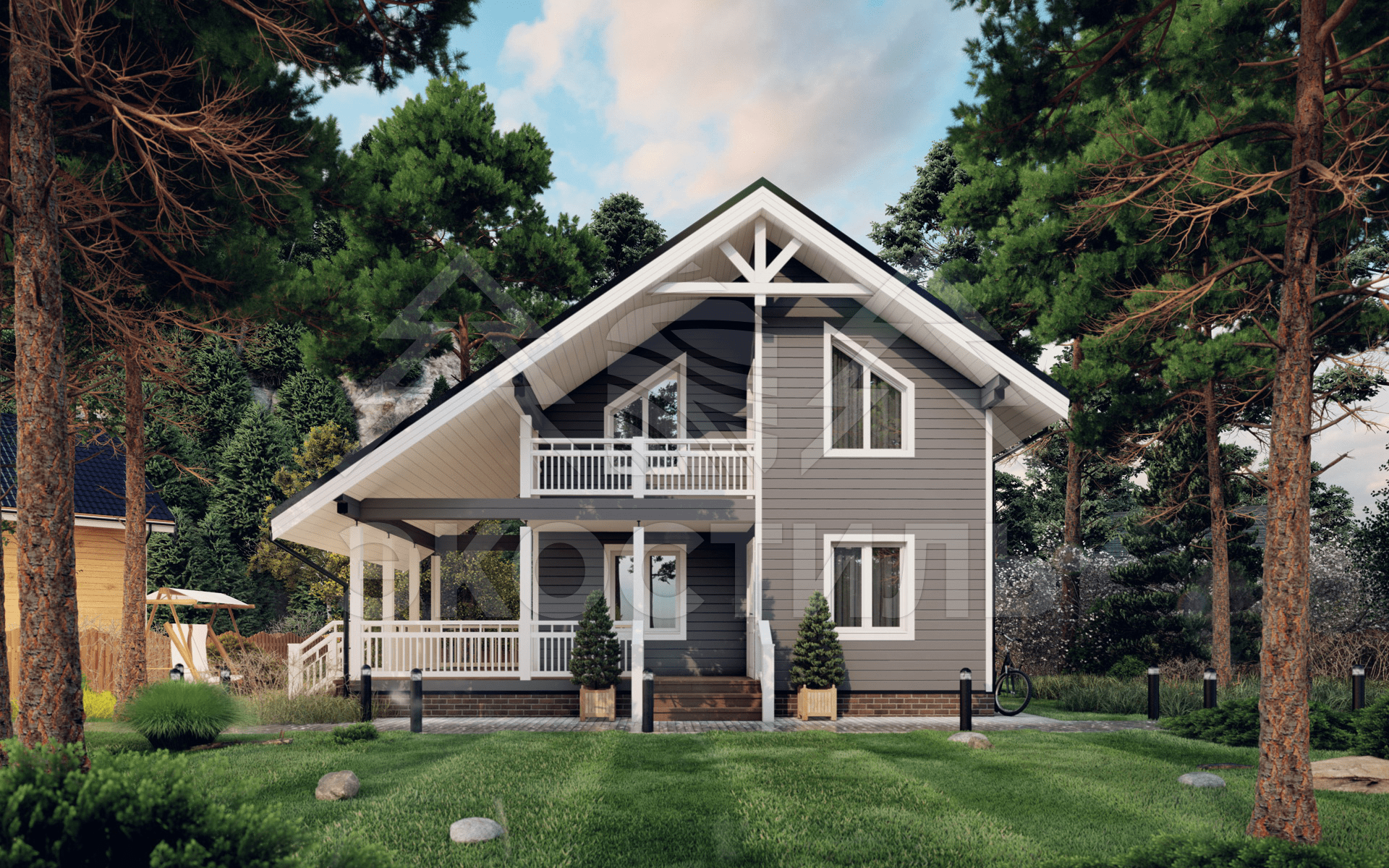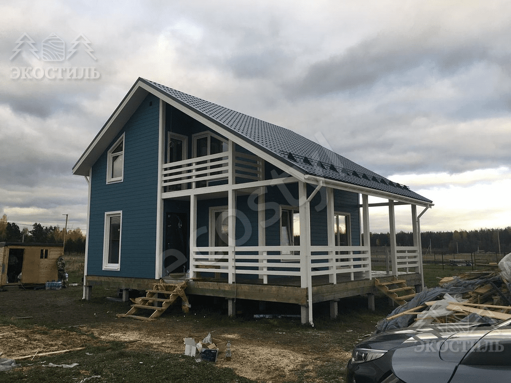 - Полуторный этаж и фронтон выполнен по каркасной технологии из доски 40х150мм принудительной сушки