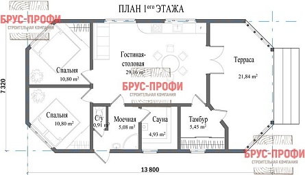 Проект одноэтажного дома Одноэтажный дом из профилированного бруса 8,5x12,2 м. с террасой