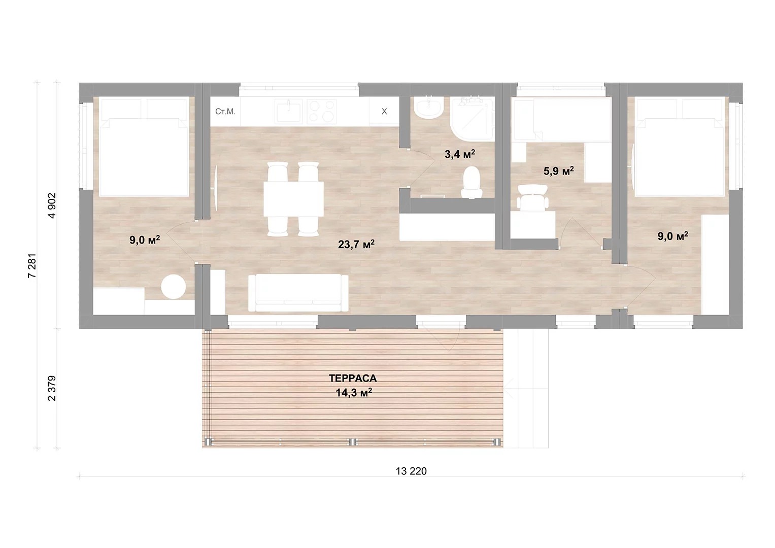 Практичный модульный дом площадью 66 м² создан для семьи с двумя детьми, предлагая комфорт в компактных размерах. 49 м² жилой зоны организованы рационально, создавая ощущение уюта и покоя. Плоская крыша придает экстерьеру современный вид, а SIP-панели обеспечивают энергоэффективность. Это место, где современные технологии служат созданию комфортного жилья.Характеристики