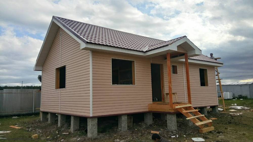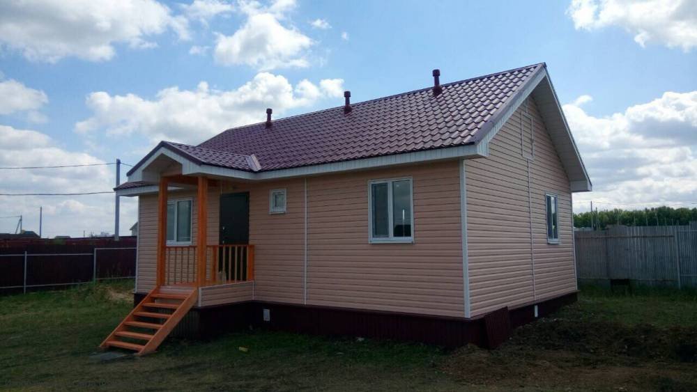 Уникальный каркасный дом площадью 70 м² с тремя спальнями отличается нестандартной кровлей. Металлочерепица и финский стиль делают его стильным.Характеристики