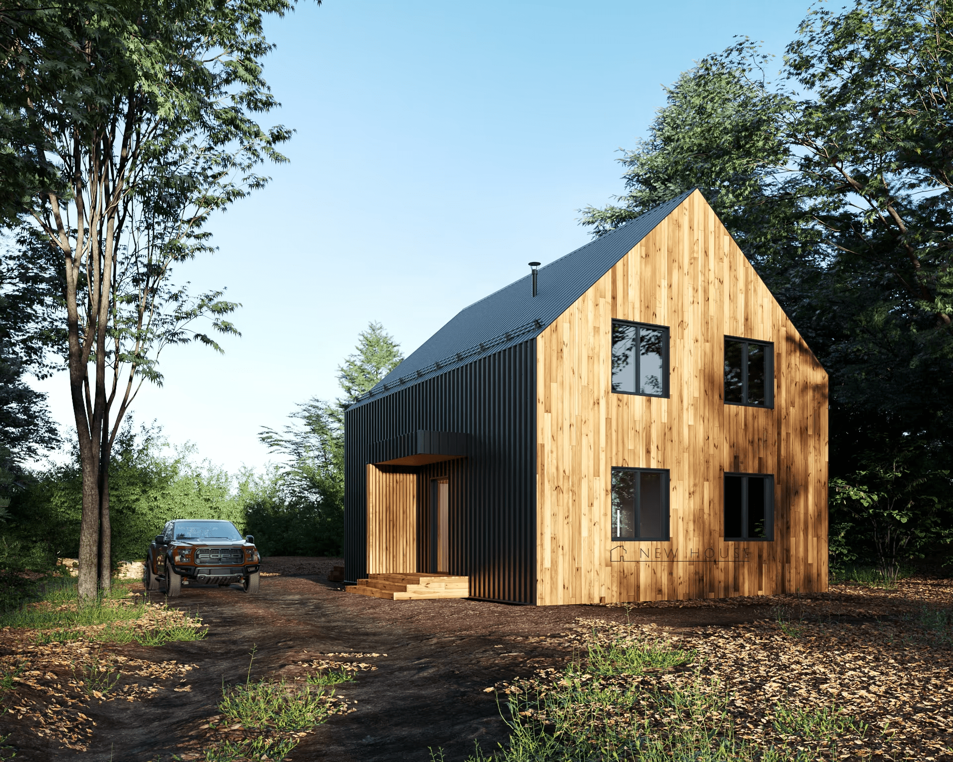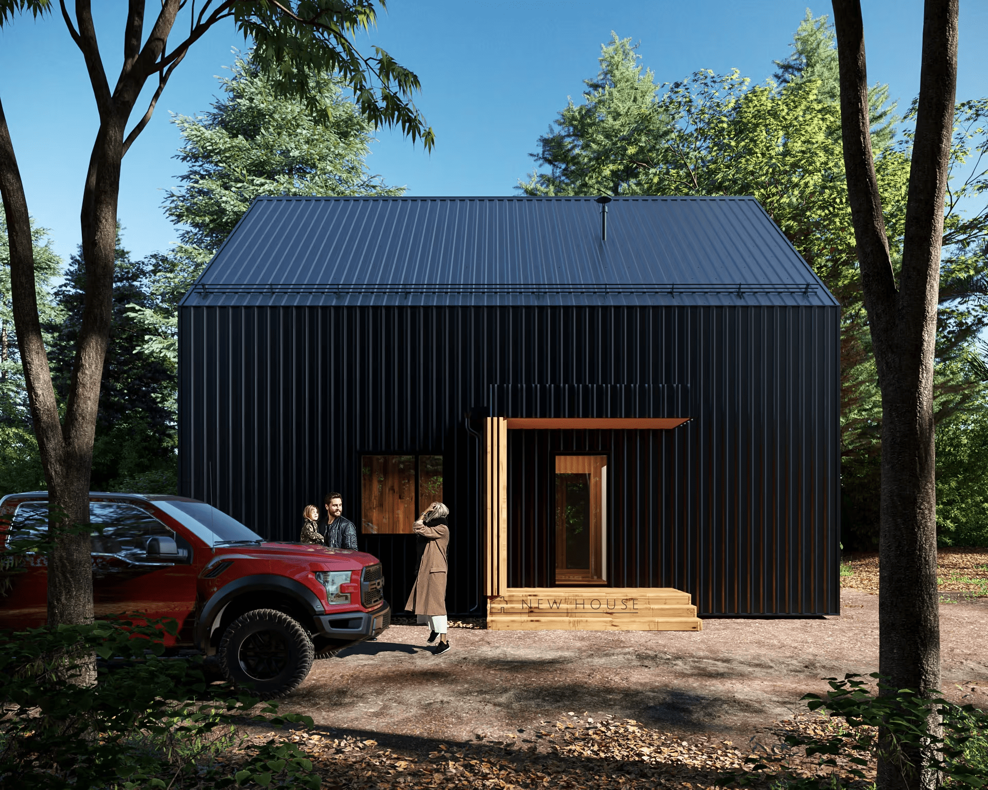 - ЧИСТОВАЯ ОТДЕЛКА ВНЕШНИХ СТЕН - боковые фасады - профнастил Grand Line С20R 0,5 мм Satin RAL 9005, торцевые фасады - скандинавская тонкопиленная доска с заводской многослойной покраской, цвет на выбор Заказчика