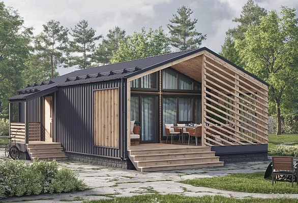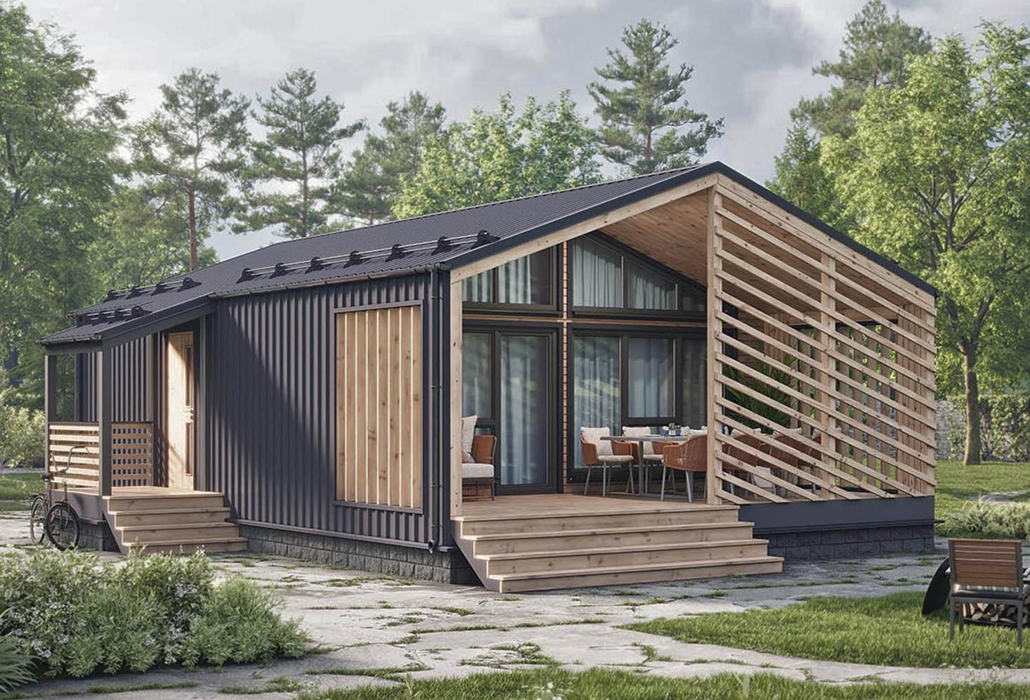 Проект одноэтажного дома Проект 7026 - Небольшой одноэтажный каркасный дом в стиле барнхаус с панорамными окнами
