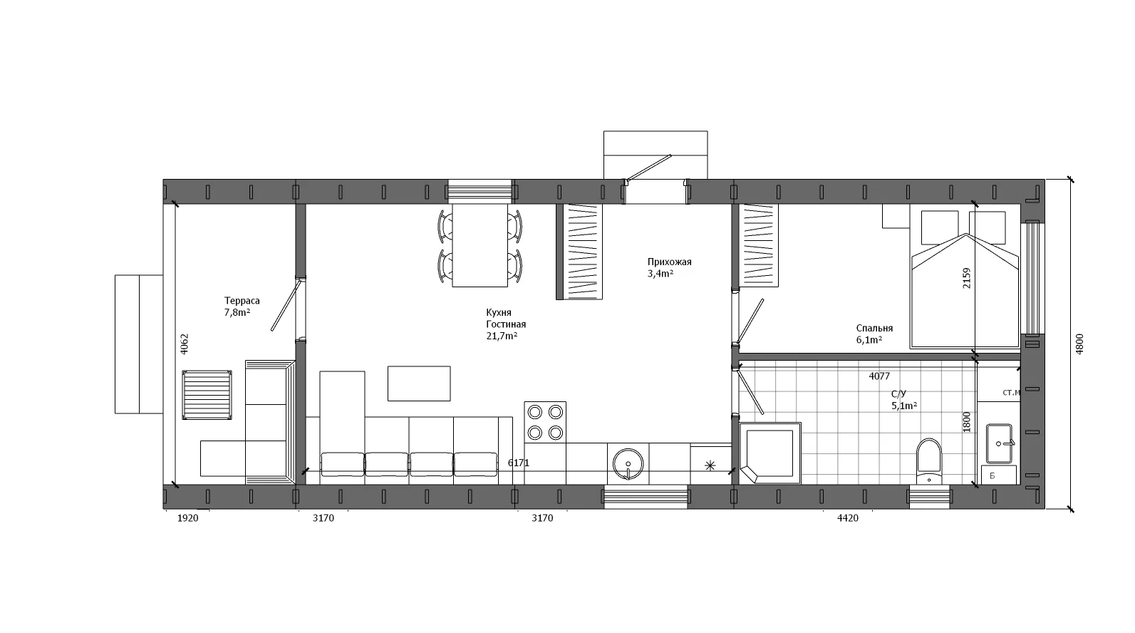 Миниатюрные 52 м² с жилыми 31 м² создают уютное пространство для одного человека. Каркасная конструкция обеспечивает тепло и надежность, а продуманная планировка делает жизнь удобной. Несмотря на небольшие размеры, здесь есть все необходимое для комфорта. Это идеальное решение для тех, кто ценит компактность и функциональность.Материалы и перечень работ