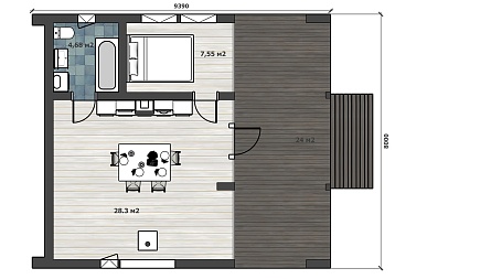 Компактное решение площадью 41 м² в стиле барнхаус идеально подходит для небольшой семьи. 28 м² жилой зоны организованы с умом, создавая атмосферу тепла и защищенности. Брус в отделке стен наполняет пространство природной гармонией, а продуманная планировка делает небольшой дом уютным и функциональным. Это место, где скромные размеры сочетаются с домашним комфортом.Характеристики