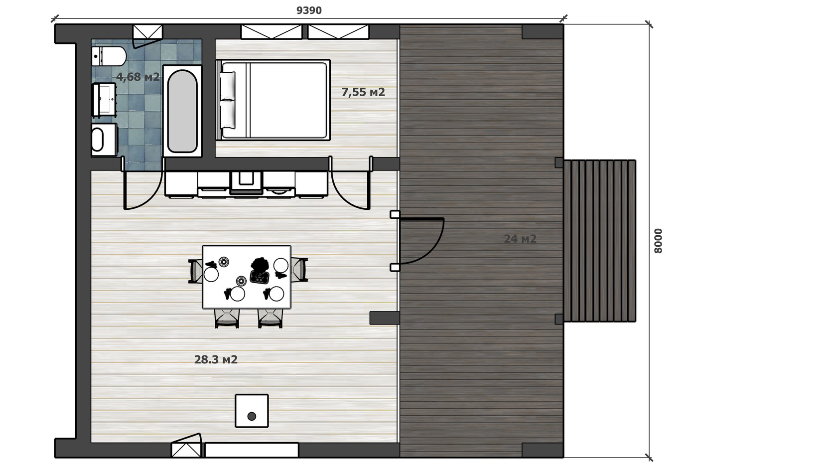 - Витражное остекление: трехслойные стеклопакеты, толщина не менее 45 мм, отделка деревянной доской