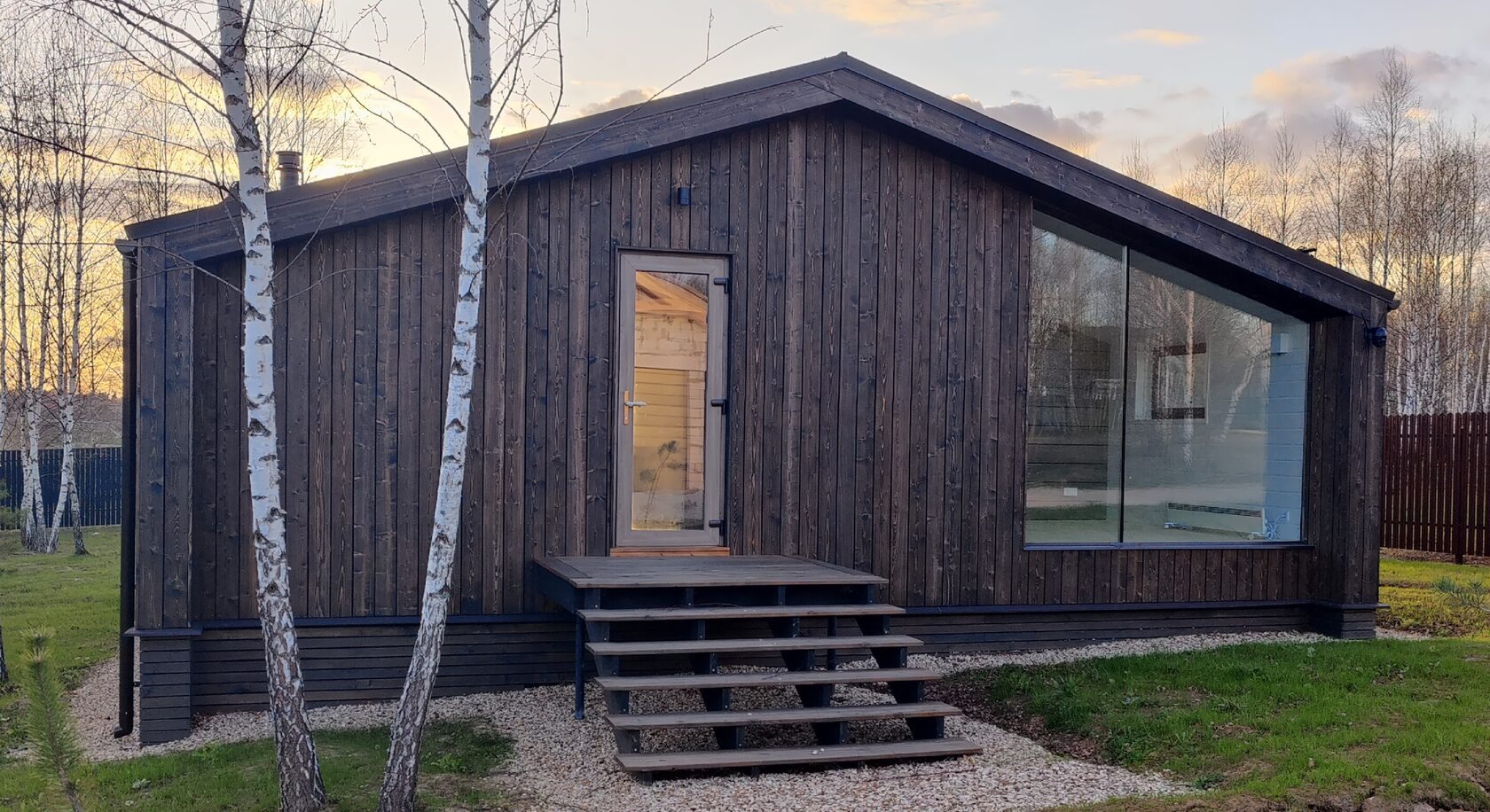 - Витражное остекление: трехслойные стеклопакеты, толщина не менее 45 мм, отделка деревянной доской