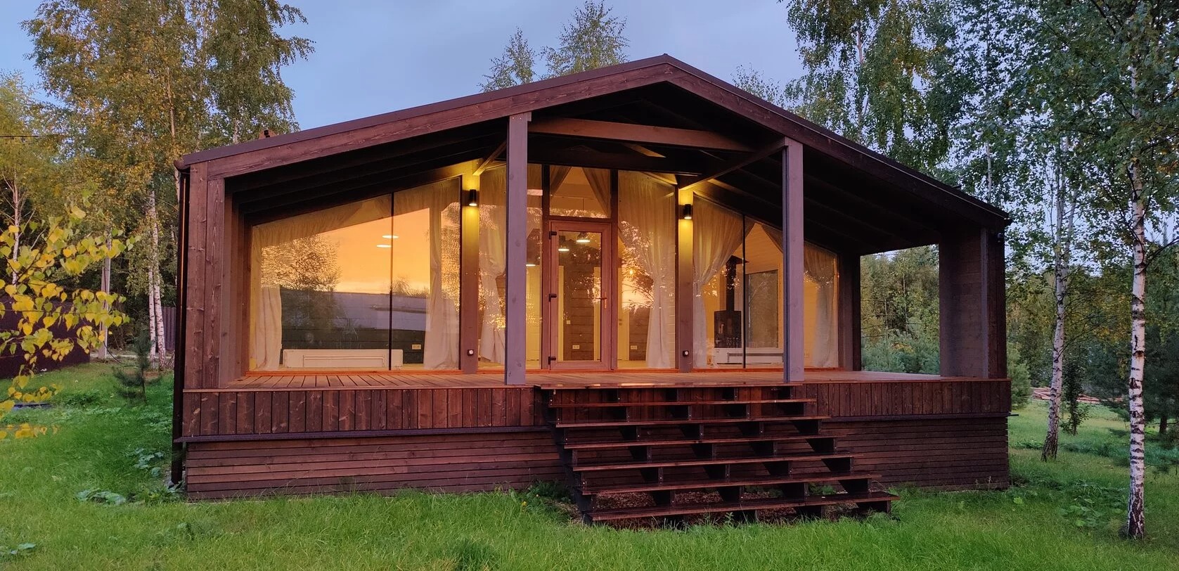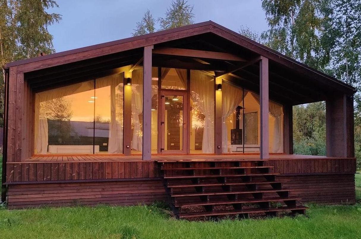 - Витражное остекление: трехслойные стеклопакеты, толщина не менее 45 мм, отделка деревянной доской