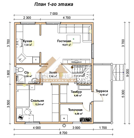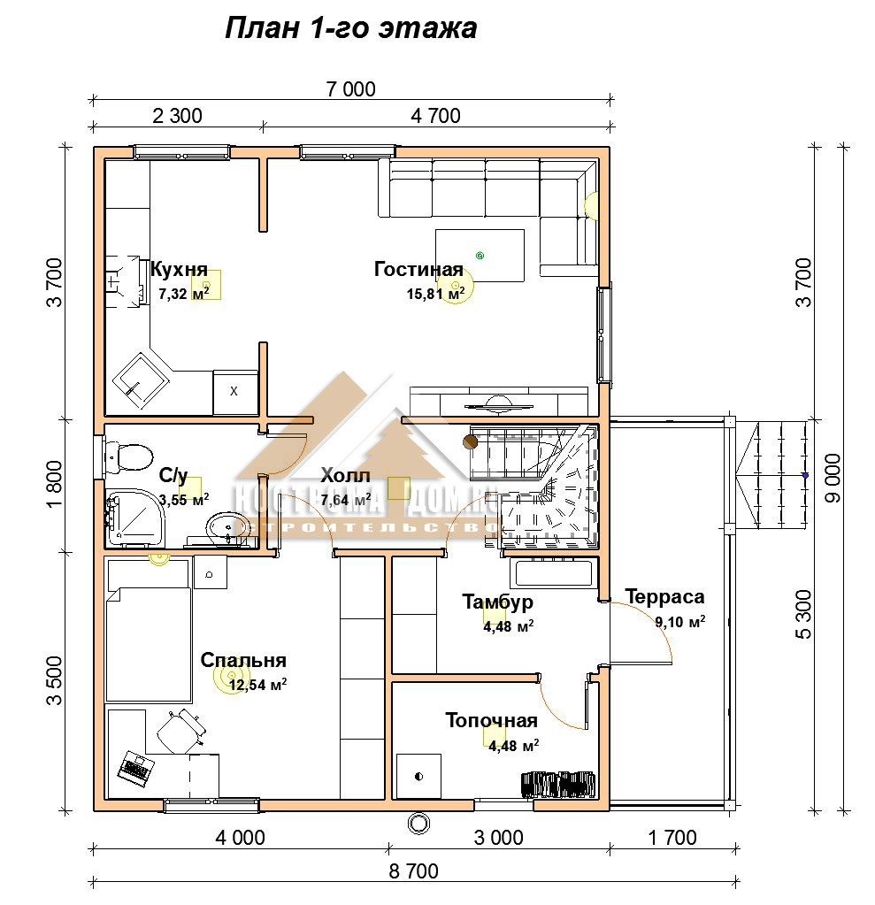 - Материал внутренних стен дома 1-го этажа: Обрезной брус 100х150 мм