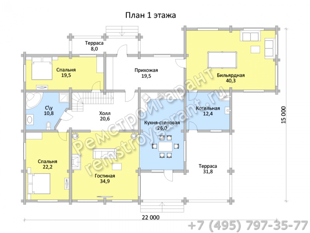 Дом, в котором хочется создавать традиции. Благодаря 375 м² можно реализовать все бытовые задачи с комфортом. Конструкция из бревна обеспечивает прочность и долговечность. Проект включает 4 спальни — удобно для семьи. Одноэтажная уютная планировка обеспечивает практичное распределение комнат.Характеристики