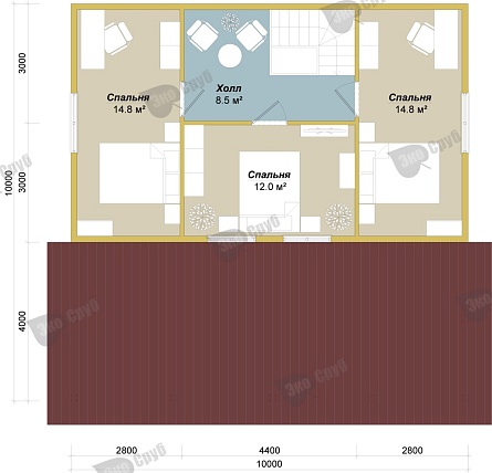 - Балки пола и потолка – брус ест. влажности 100х150 мм., с шагом – 590 мм.