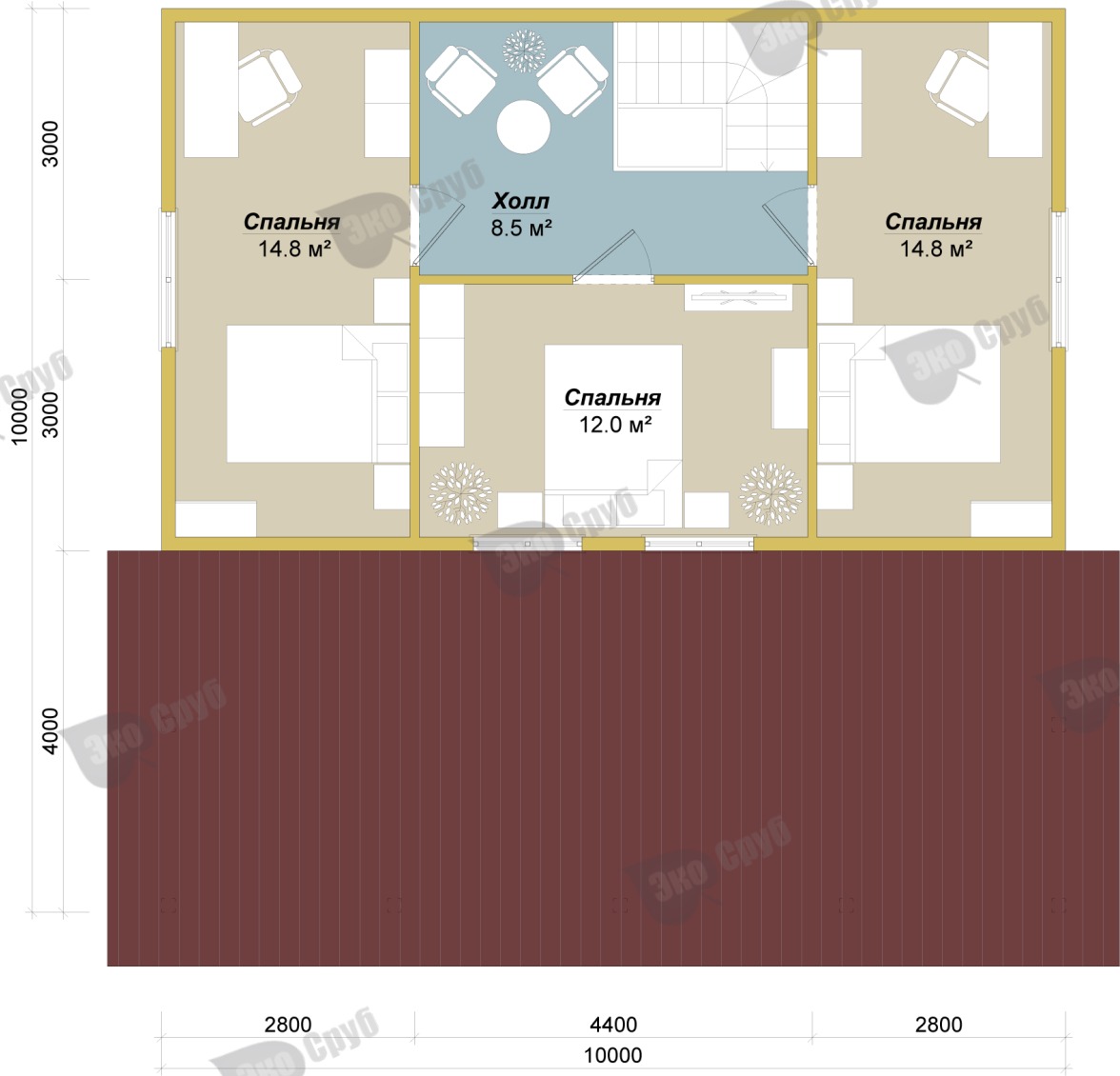- Фронтоны – брус ест. влажности 150х150 мм. (до ригеля)