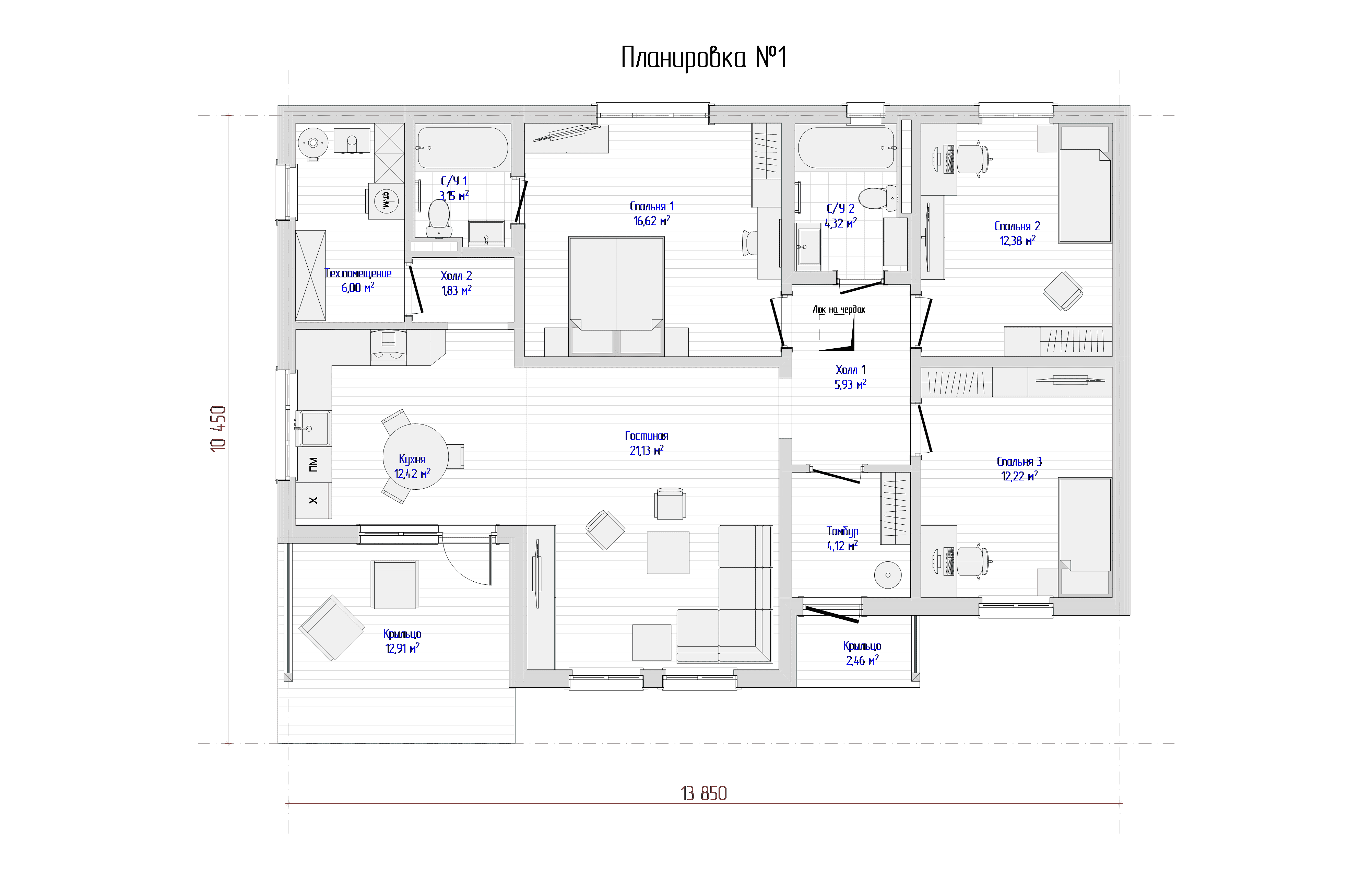 Проект одноэтажного дома Просторный, под ключ, ламинат, двери Экошпон, отделка Hauberk, коммуникации, сантехника.