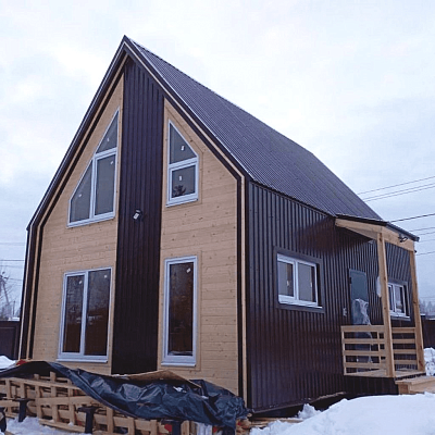 Двухэтажный каркасный дом площадью 74 м² подойдет для семьи с ребенком. Жилая зона 50 м² распределена между этажами, создавая ощущение простора и уюта. Профнастил на кровле добавляет надежности, а две спальни обеспечивают комфорт для всех жильцов. Здесь гармонично сочетаются современность и домашний уют.Характеристики