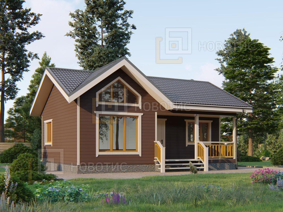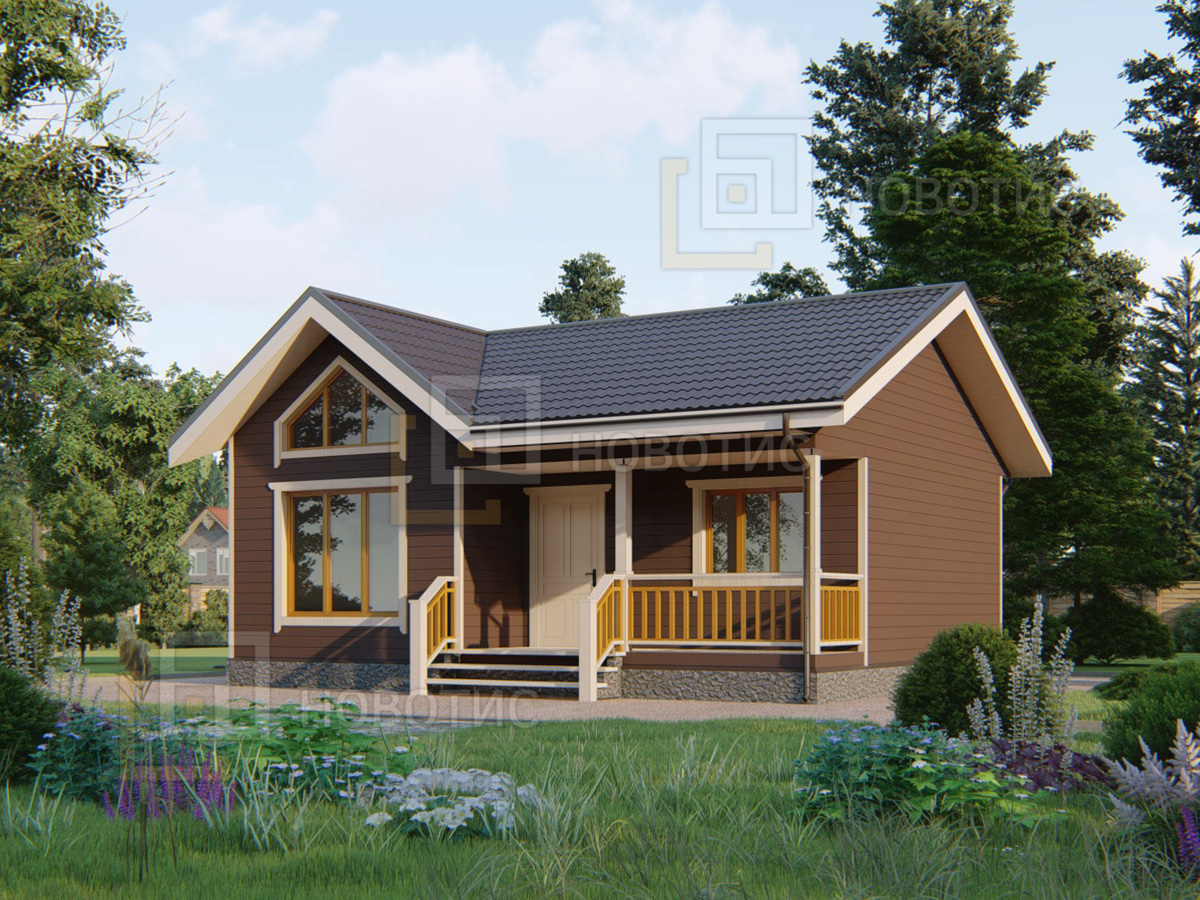 Каркасный дом площадью 55 м² в стиле шале с двумя спальнями — это компактность и стиль. Один этаж делает его удобным для жизни, а металлочерепица завершает образ.Характеристики