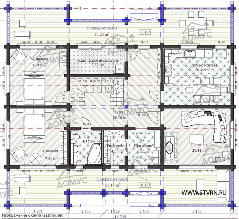 Проект двухэтажного дома Проект 1668 - дом из клееного бруса с большой гостиной и 4 спальнями