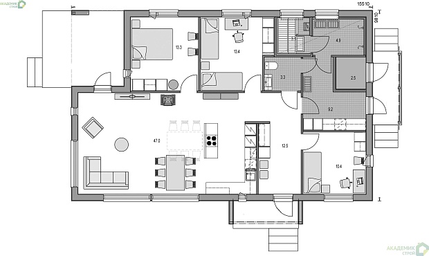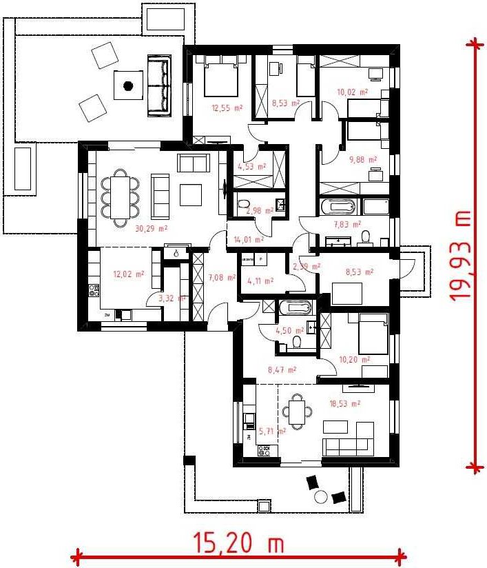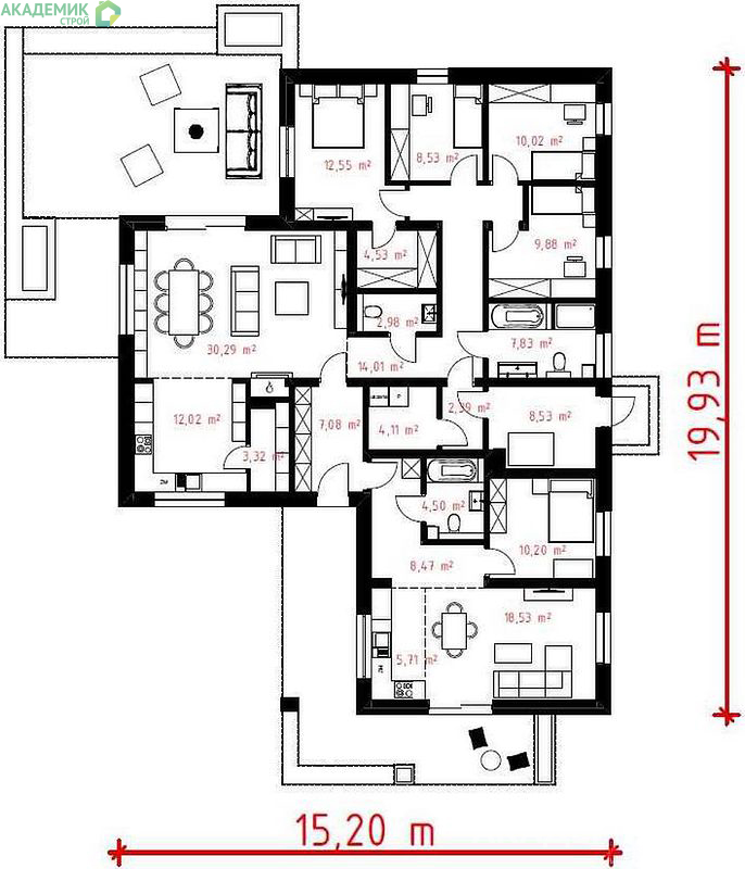 Одноэтажный дом площадью 185 м² (жилых — 176 м²) с пятью комнатами и тремя санузлами — это настоящий простор для большой семьи. В проекте нет гаража, зато предусмотрена большая кухня-гостиная и отдельные спальни для каждого члена семьи. Светлые интерьеры и высокий потолок создают ощущение свободы. Такой дом отлично подойдёт для тех, кто любит принимать гостейГарантии: 16 лет гарантии