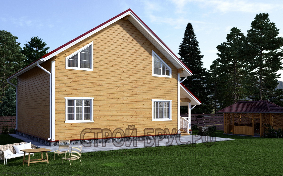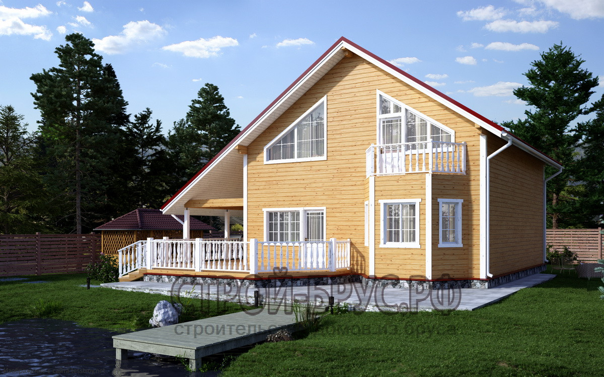 Просторный дом площадью 168 м² из бруса с большой террасой и рубероидной кровлей подойдет для большой семьи. Четыре спальни и два этажа создают удобное пространство. Русский стиль придает проекту традиционное очарование. Натуральные материалы гарантируют уют и долговечность.Характеристики